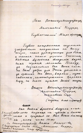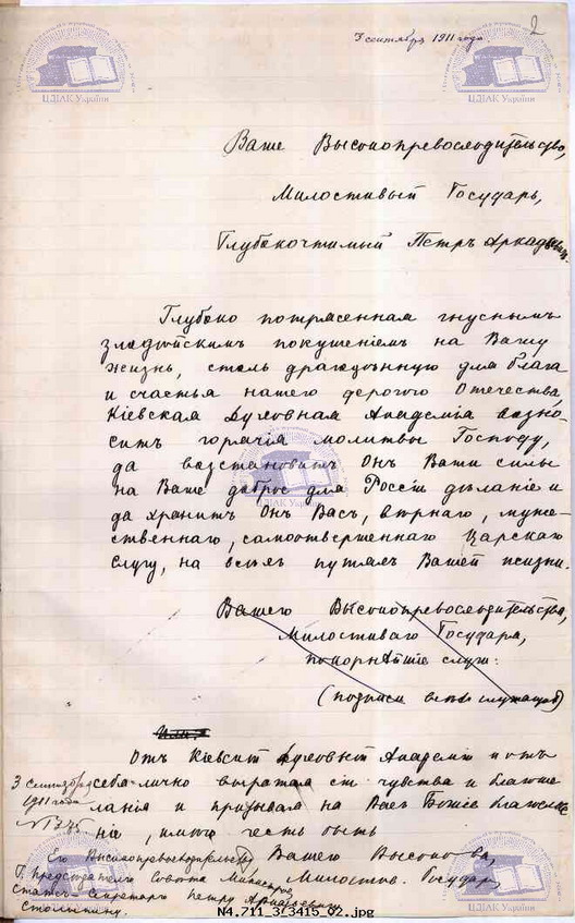 1911 р., вересня 3. – Лист ректора Київської духовної академії єпископа Інокентія до П. А. Столипіна з виразами співчуття з приводу скоєного на нього замаху