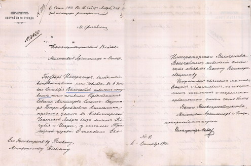 1911 р., вересня 6. – Лист обер-прокурора Синоду В. К. Саблера до митрополита Київського Флавіана з повідомленням про розпорядження Миколая ІІ щодо поховання тіла П. А. Столипіна у Києво-Печерській лаврі