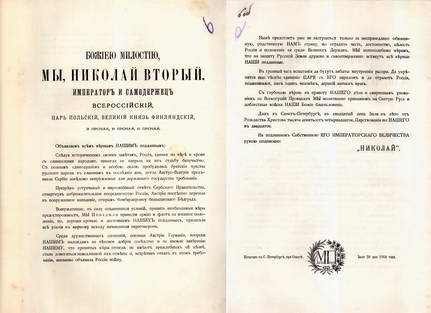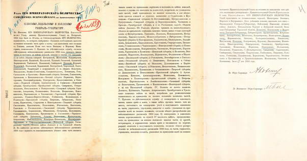 1914 р., липня 18. – Опреділення Правлячого Сенату з текстом указу імператора Миколи ІІ про оголошення воєнного стану та мобілізацію військовозобов’язаних.