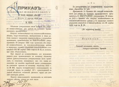 1916 р., квітня 1. – Наказ по Київському військовому округу про затвердження правил використання військовополонених для робіт на приватних промислових підприємствах.
