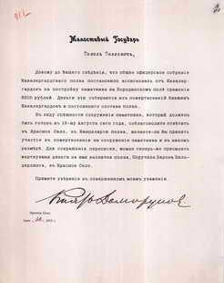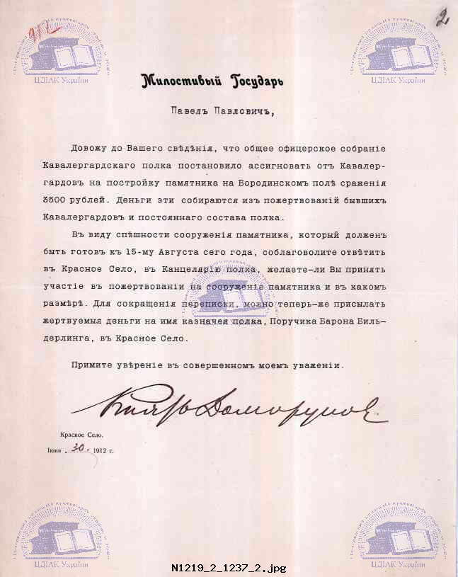 1912 р., червня 30. – Лист князя Долгорукова до П. П. Скоропадського щодо його участі у зборі пожертв на спорудження пам’ятника на Бородинському полі.