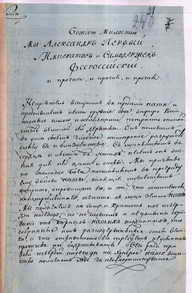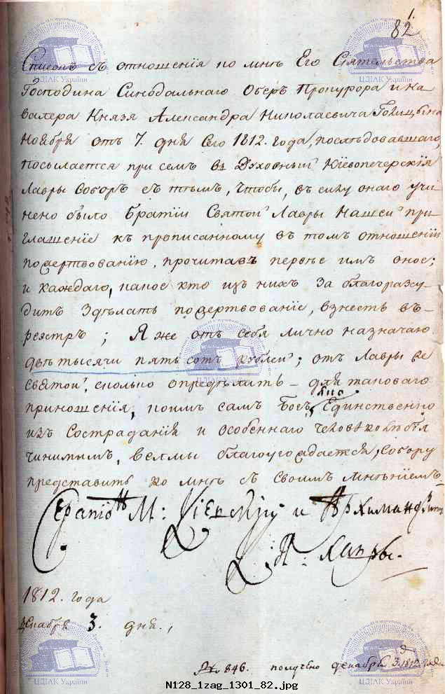 1812 р., грудня 3. – Лист митрополита Київського Серапіона (Александровського) щодо збору пожертв на користь потерпілих внаслідок вторгнення французької армії.