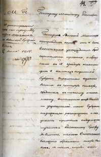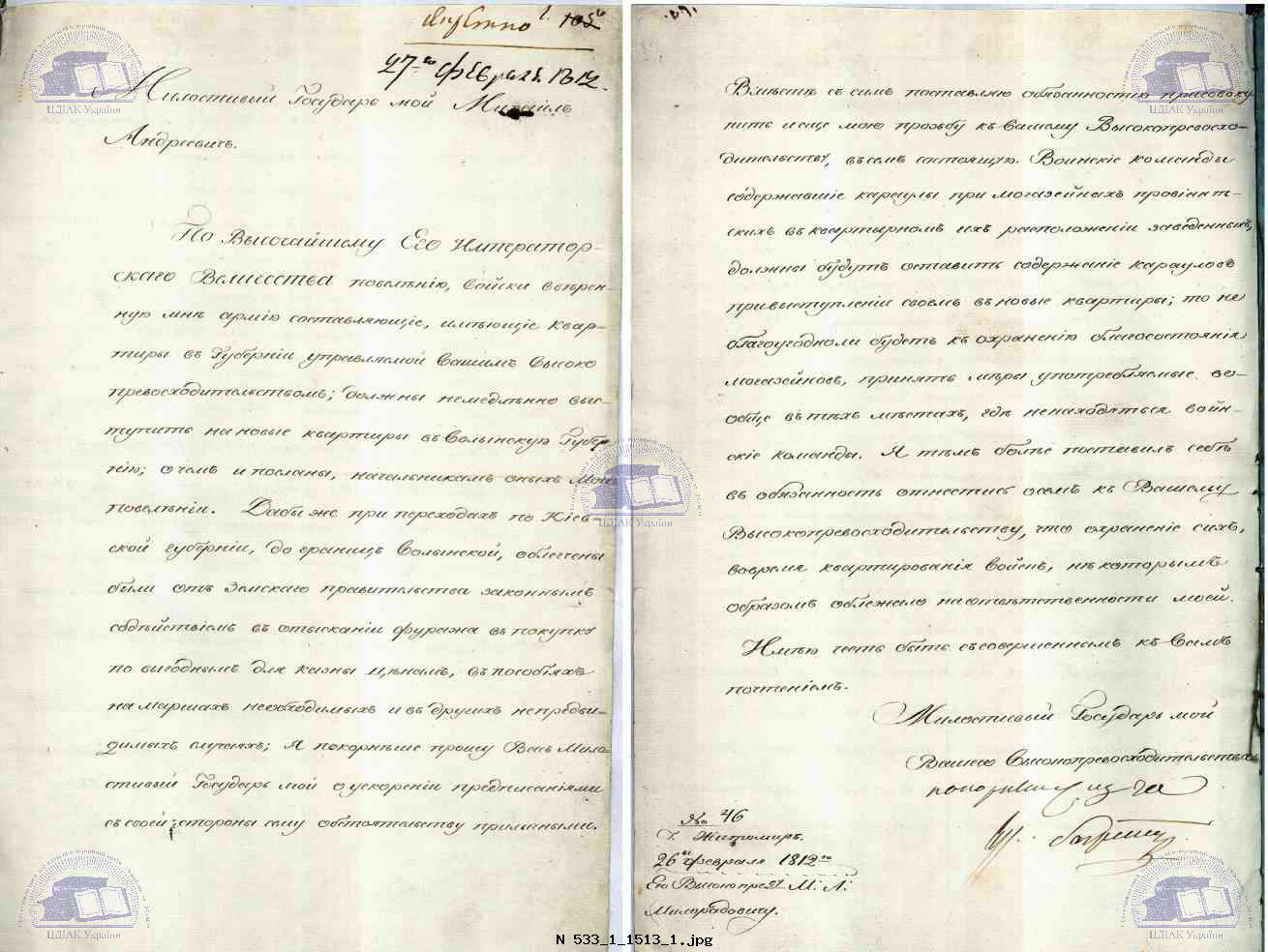 1812 р., лютого 27. – Лист командувача 2-ю Західною армією П. І. Багратіона до київського військового губернатора М. А. Милорадовича щодо забезпечення військ, що проходитимуть через Київську губернію у Волинську для розквартирування.