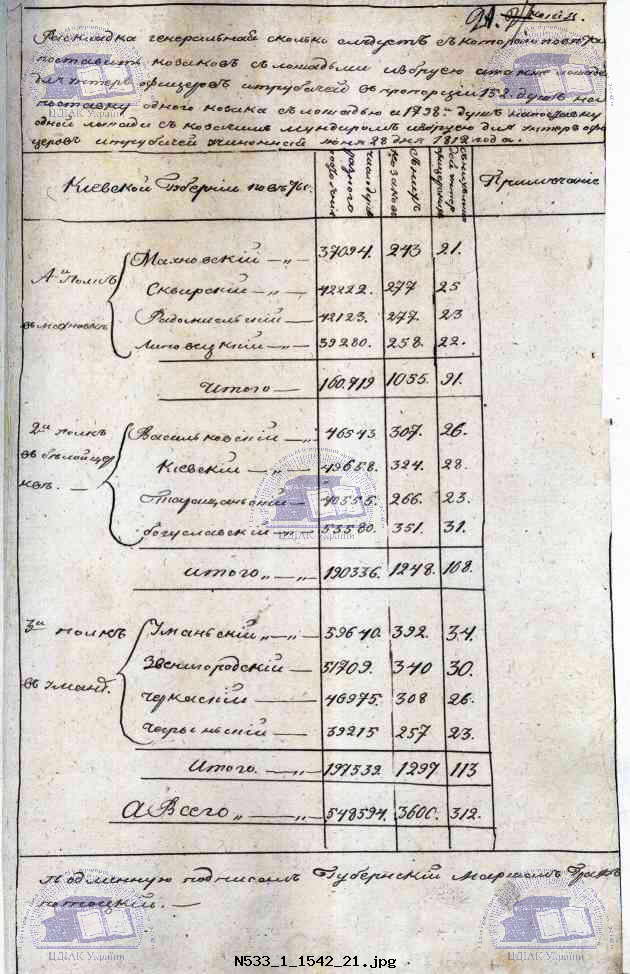 1812 р., червня 28. – Попередня відомість про кількісний склад козацьких полків, що формувалися у Київській губ. Відпуск