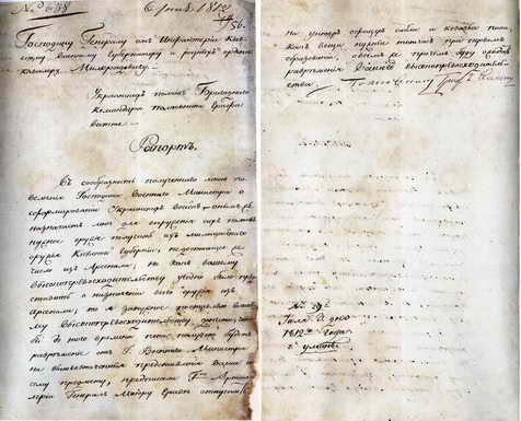 1812 р., липня 6. – Рапорт бригадного командира Українських полків І. Й. Вітте київському військовому губернатору М. А. Милорадовичу щодо озброєння козацьких полків, що формувалися у Київській губ.