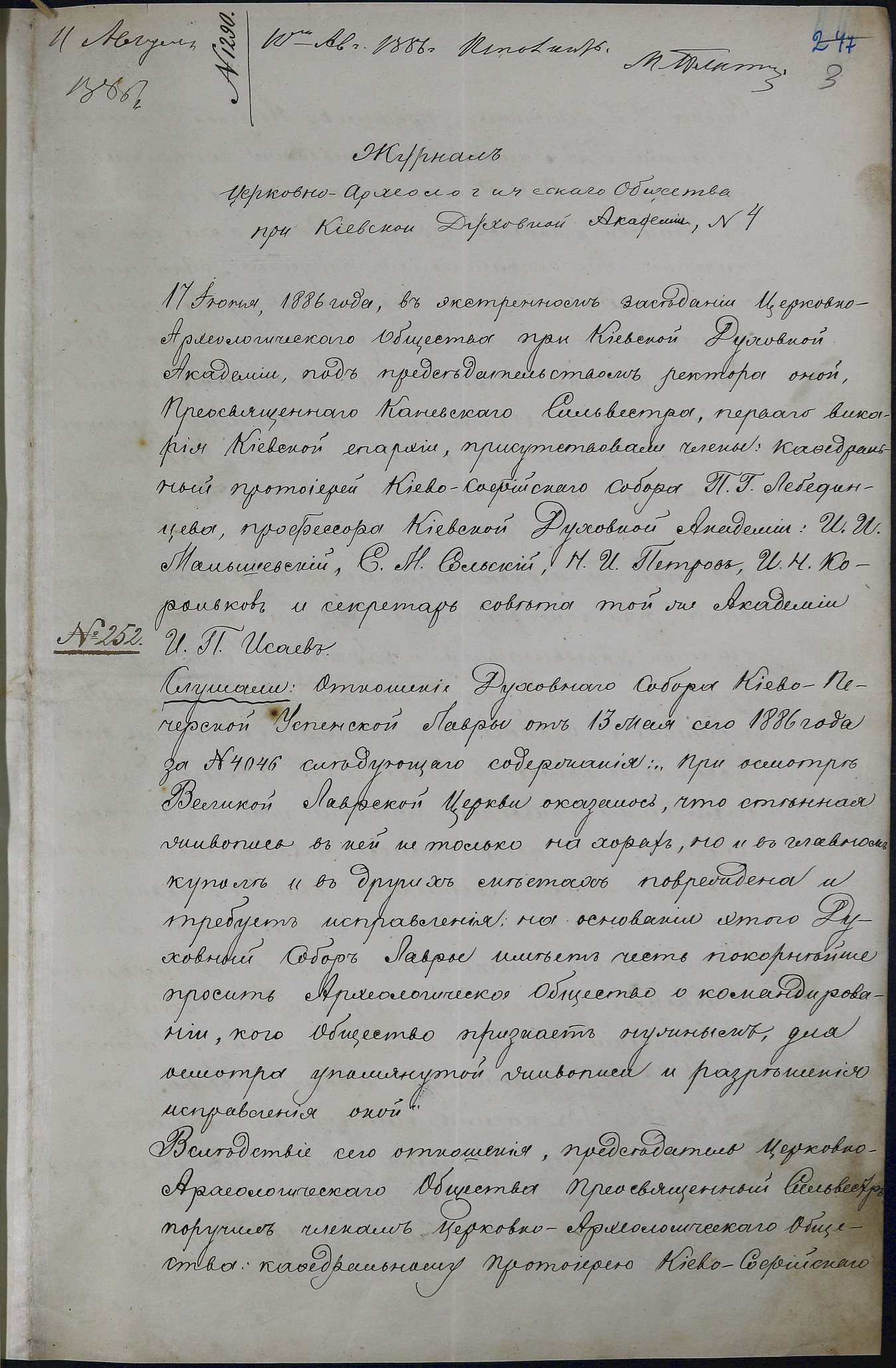1886 р., червень 17 – Висновки комісії Київського Церковно-археологічного товариства щодо цінності стінопису Великої Печерської церкви за протоколом засідання.