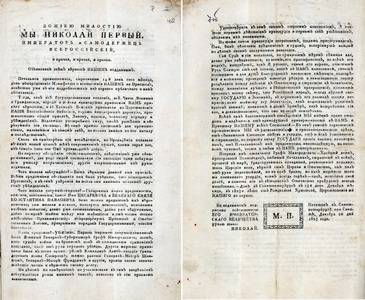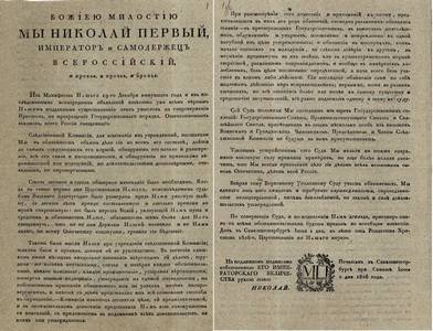 1825 р., грудня 20. – Маніфест Миколи І про події на Сенатській площі у Санкт-Петербурзі 14 грудня 1825 р.