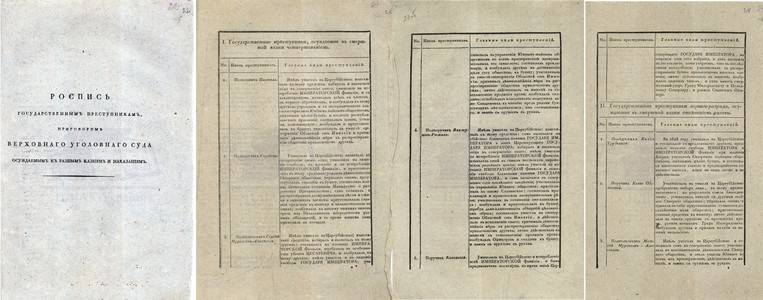 1826 р., липня 10. – Список підсудних у справі декабристів з указанням призначеного для них покарання.