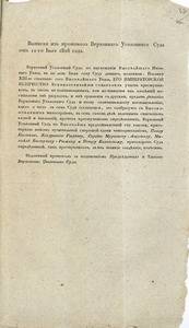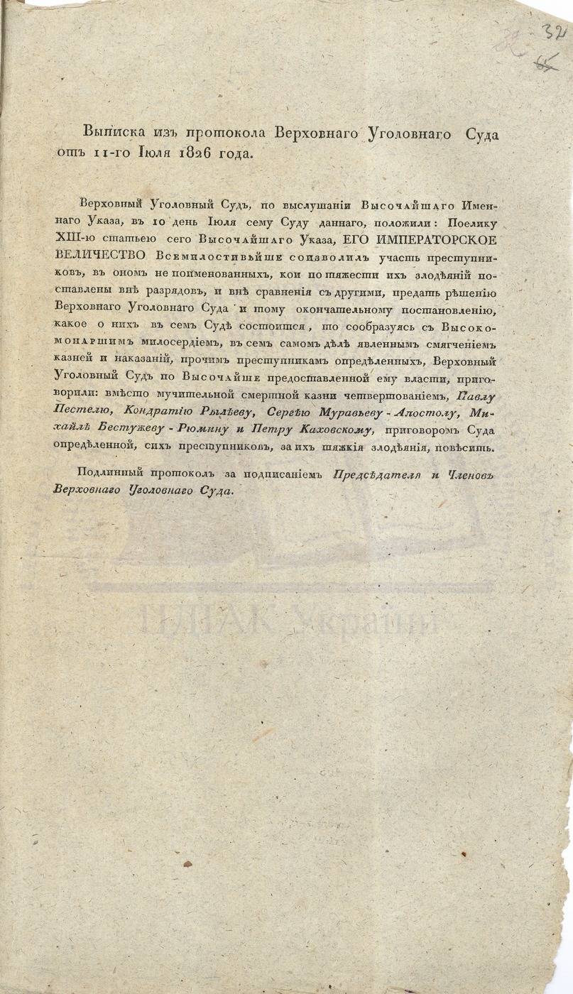 1826 р., липня 11. – Виписка з протоколу Верховного кримінального суду про заміну п’ятьом декабристам, засудженим до смертної кари, четвертування повішенням.