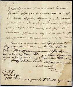 1825 р., грудня 25. – Лист Миколи І до митрополита Київського Євгенія (Болховітінова) із висловленням вдячності за виявлену мужність