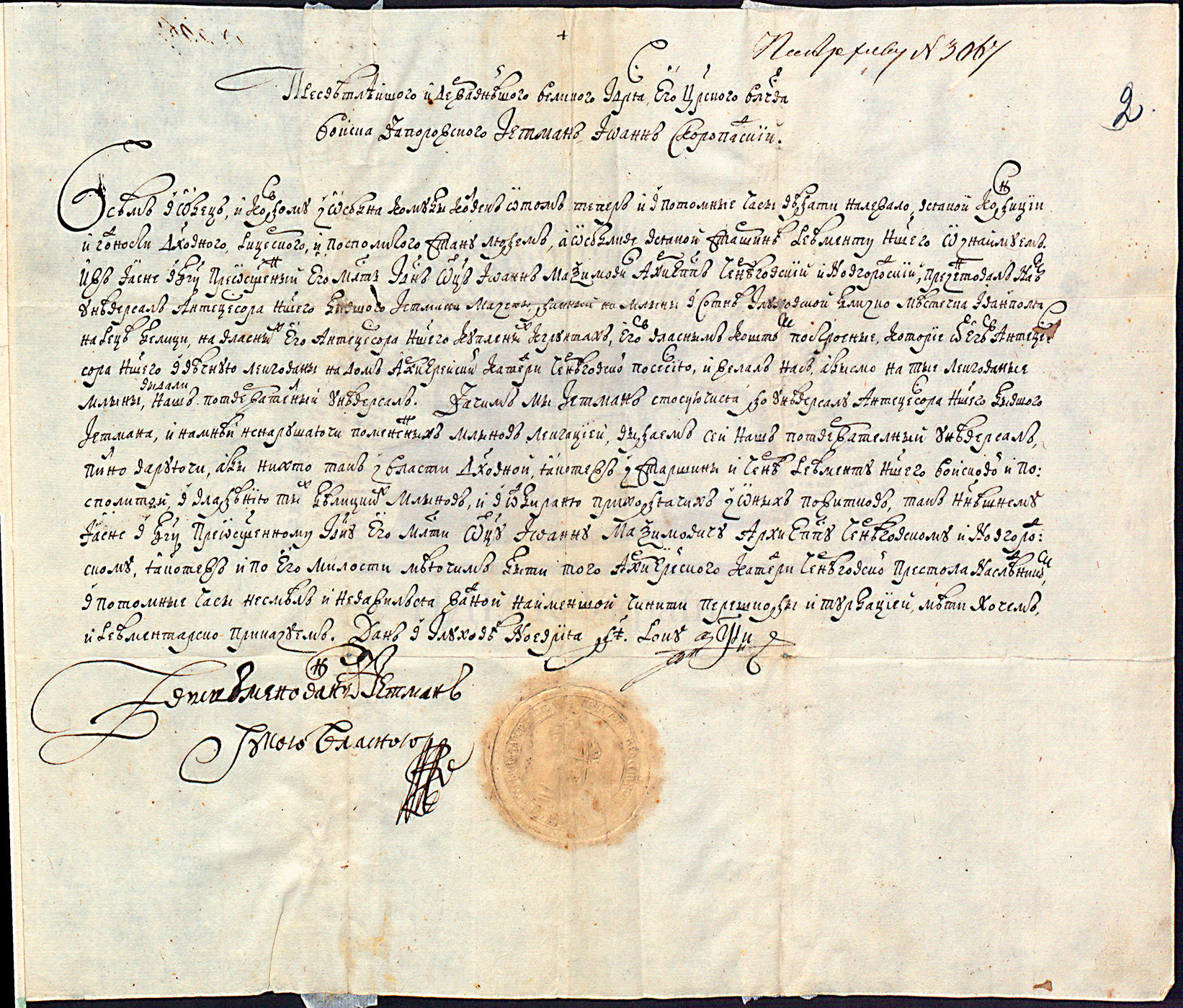 1708 р., листопада 14. Глухів. – Універсал гетьмана Івана Скоропадського Чернігівському і Новгород-Сіверському архімандритові Іоану Максимовичу