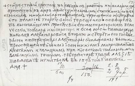 1896 р. квітня 25. – Проект напису на престолі Володимирського собору, пожертвуваному М. А. Терещенком.