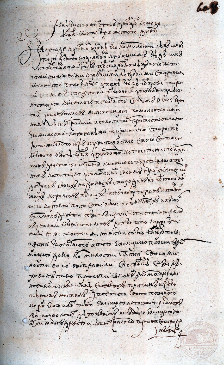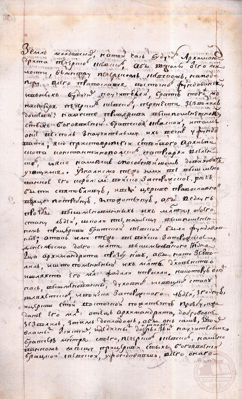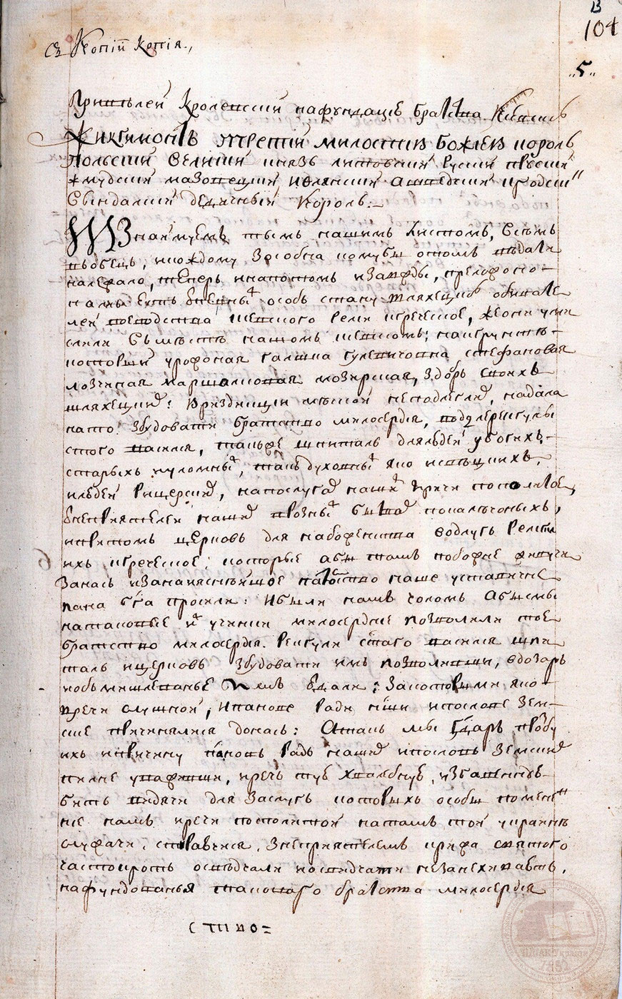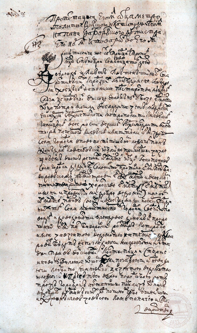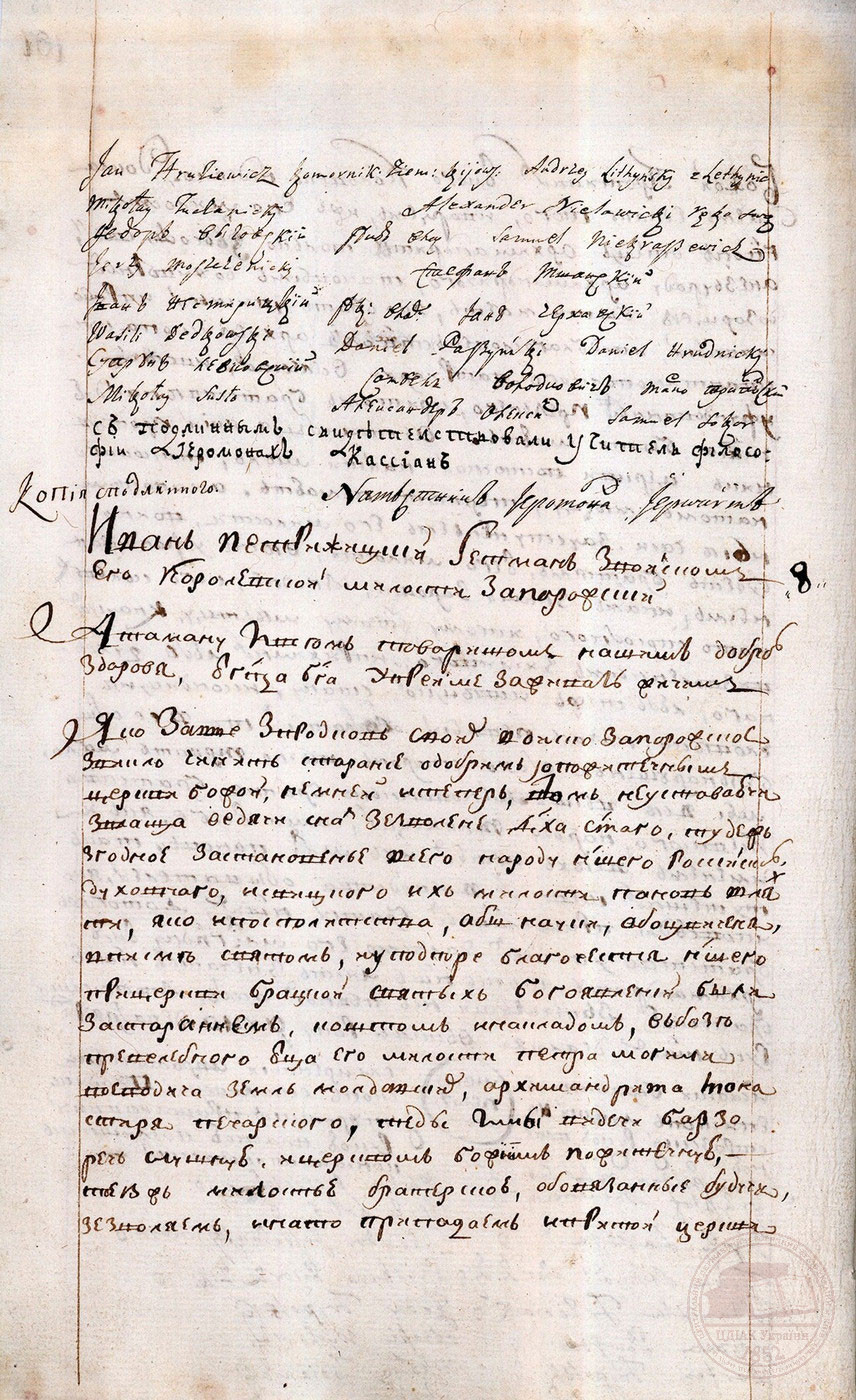 ЦДІАК України, ф. 182, оп. 2, спр. 75, арк. 1 і зв. Копія XVIIІ ст.