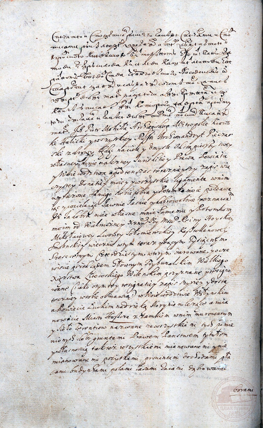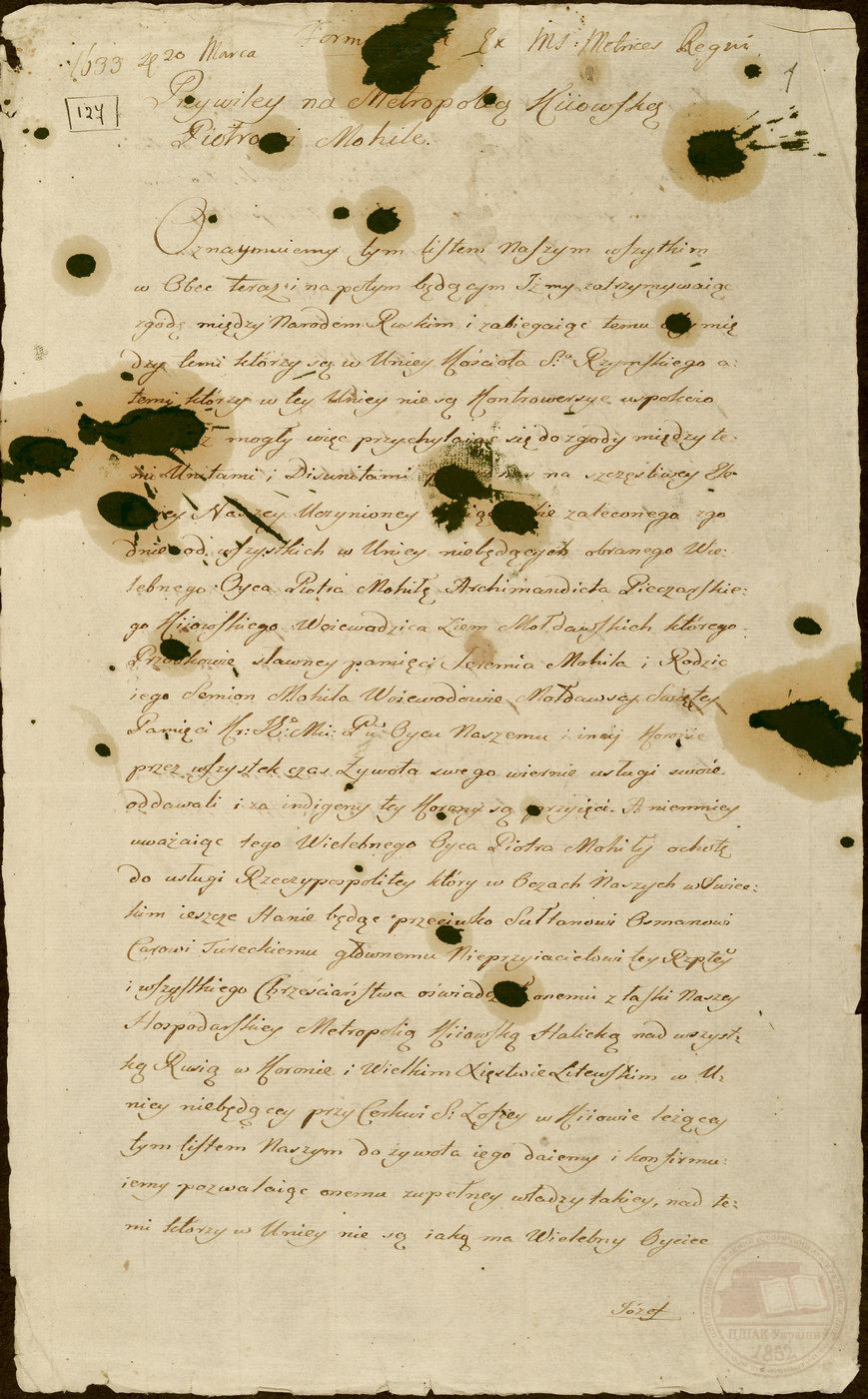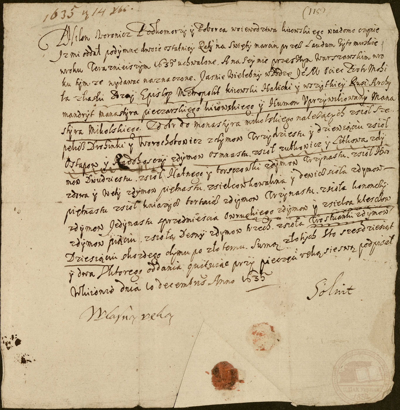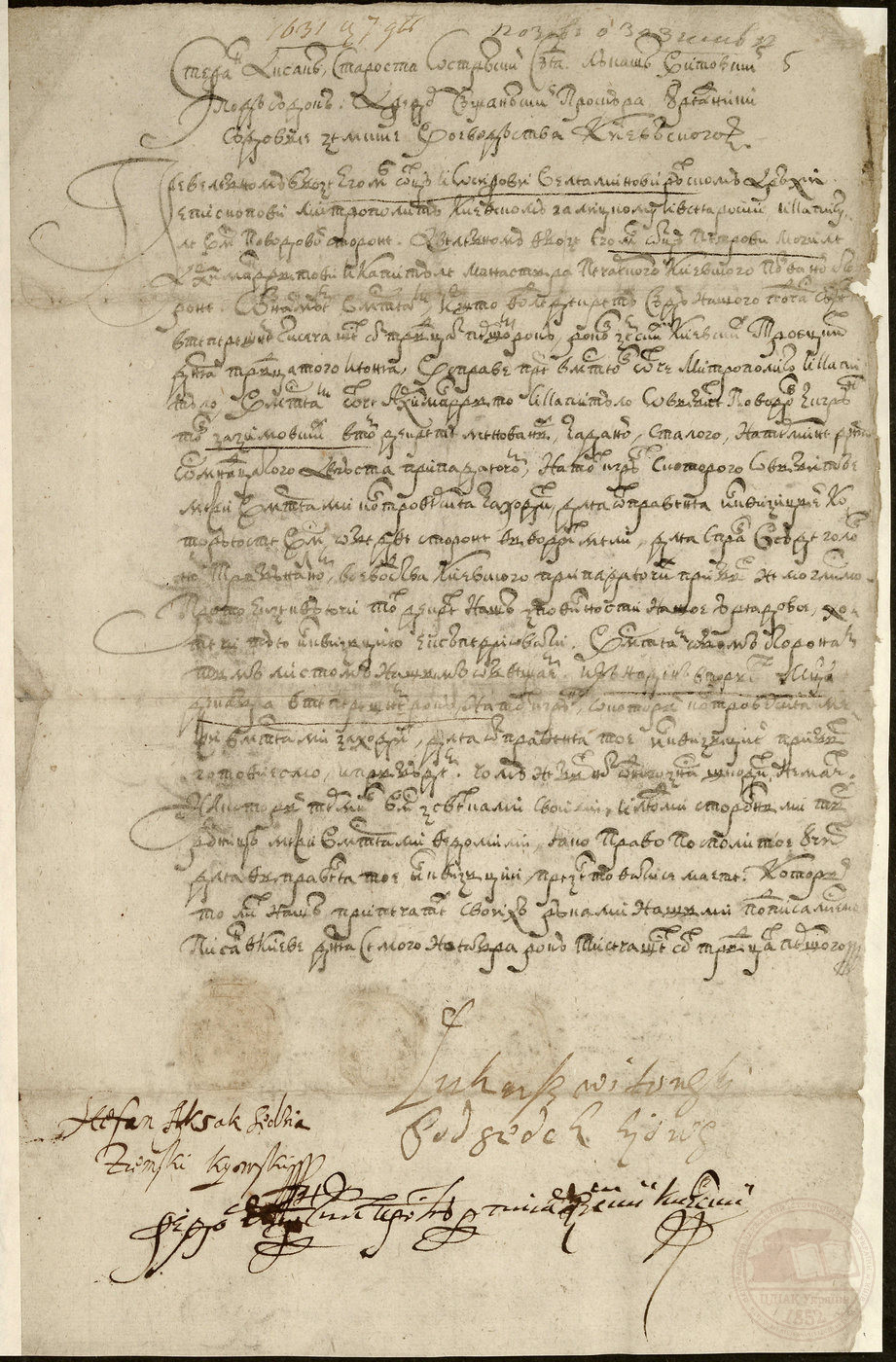 ЦДІАК України, ф. 222, оп. 1, спр. 175-а, арк. 1. Оригінал. Печатка і автограф Петра Могили.