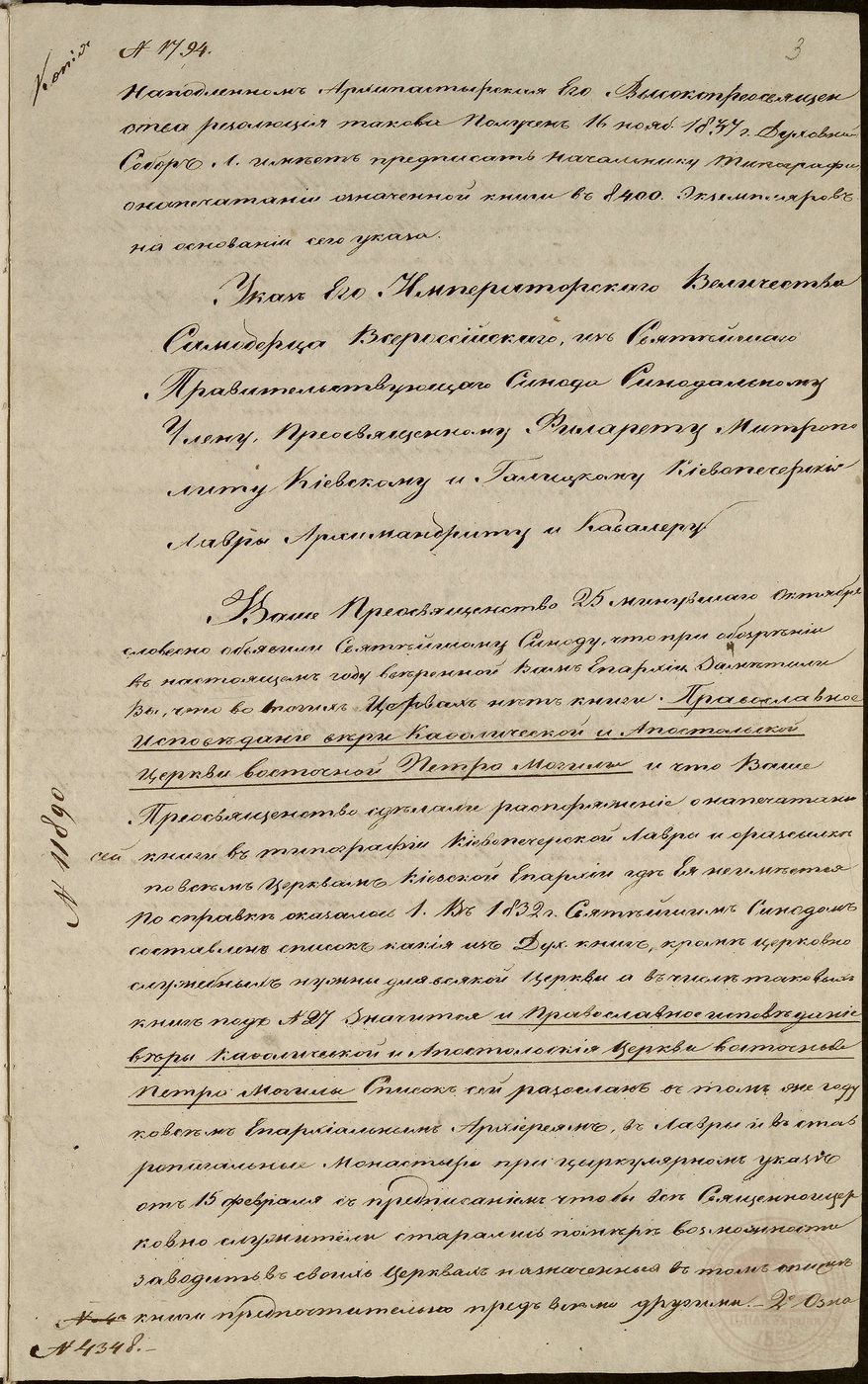 1837–1938 рр. – Документи про перевидання в друкарні Києво-Печерської лаври книги Петра Могили “Православноє исповѣданіє вєры ...”