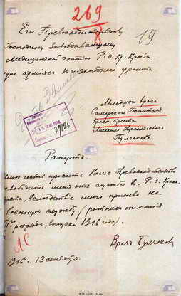 1916 р., вересня 13. – Рапорт молодшого лікаря Самарського шпиталю Червоного Хреста М. А. Булгакова завідувача медичною частиною Російського товариства Червоного Хреста при арміях Південно-Західного фронту про звільнення зі служби в Червоному Хресті, в зв’язку з призивом на військову службу.