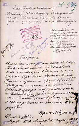 1916 р., квітня 4. – Прохання випускника медичного факультету університету св. Володимира М. А. Булгакова до завідувача медичною частиною Російського товариства Червоного Хреста при арміях Південно-Західного фронту надати посаду лікаря в одному з медичних закладів Червоного Хреста.