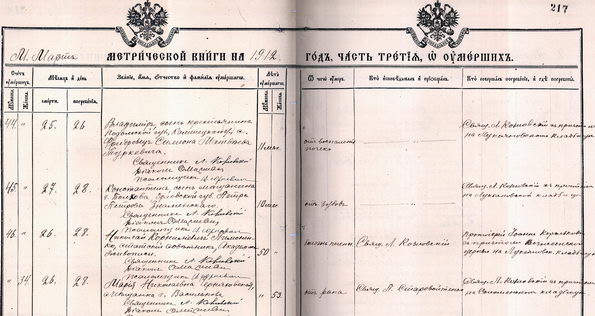 1912 р., березня 26. ̶ Запис про смерть статського радника, академіка живопису Миколи Корниловича Пимоненка у метричній книзі Старокиївської Вознесенської церкви в м. Києві.