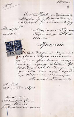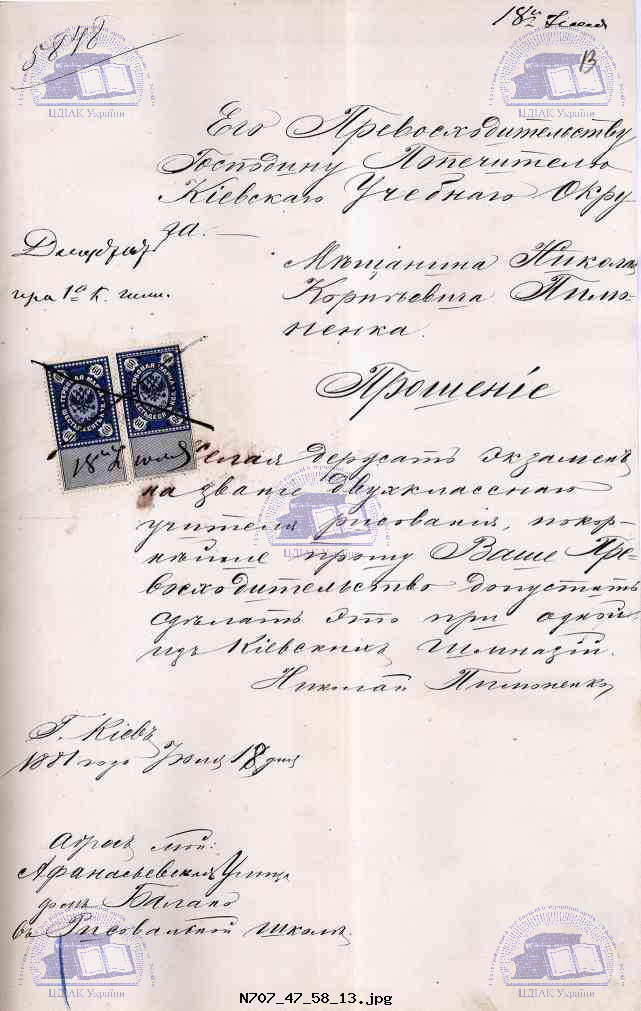1881 р., липня 18. ̶ Прохання М. К. Пимоненка до попечителя Київського навчального округу про бажання скласти іспит на звання двокласного вчителя малювання. Автограф.