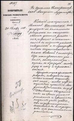 1881 р., листопада 20. ̶ Відношення попечителя Київського навчального округу до Академії мистецтв про направлення малюнків М. Пимоненка з проханням присвоїти останньому звання вчителя малювання, креслення та чистописання.