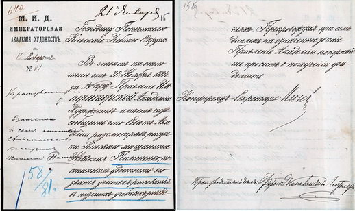 1882 р., січня 12. ̶ Повідомлення конференц-секретаря Академії мистецтв попечителю Київського навчального округу про присвоєння М. Пимоненку звання вчителя малювання у нижчих навчальних закладах.
