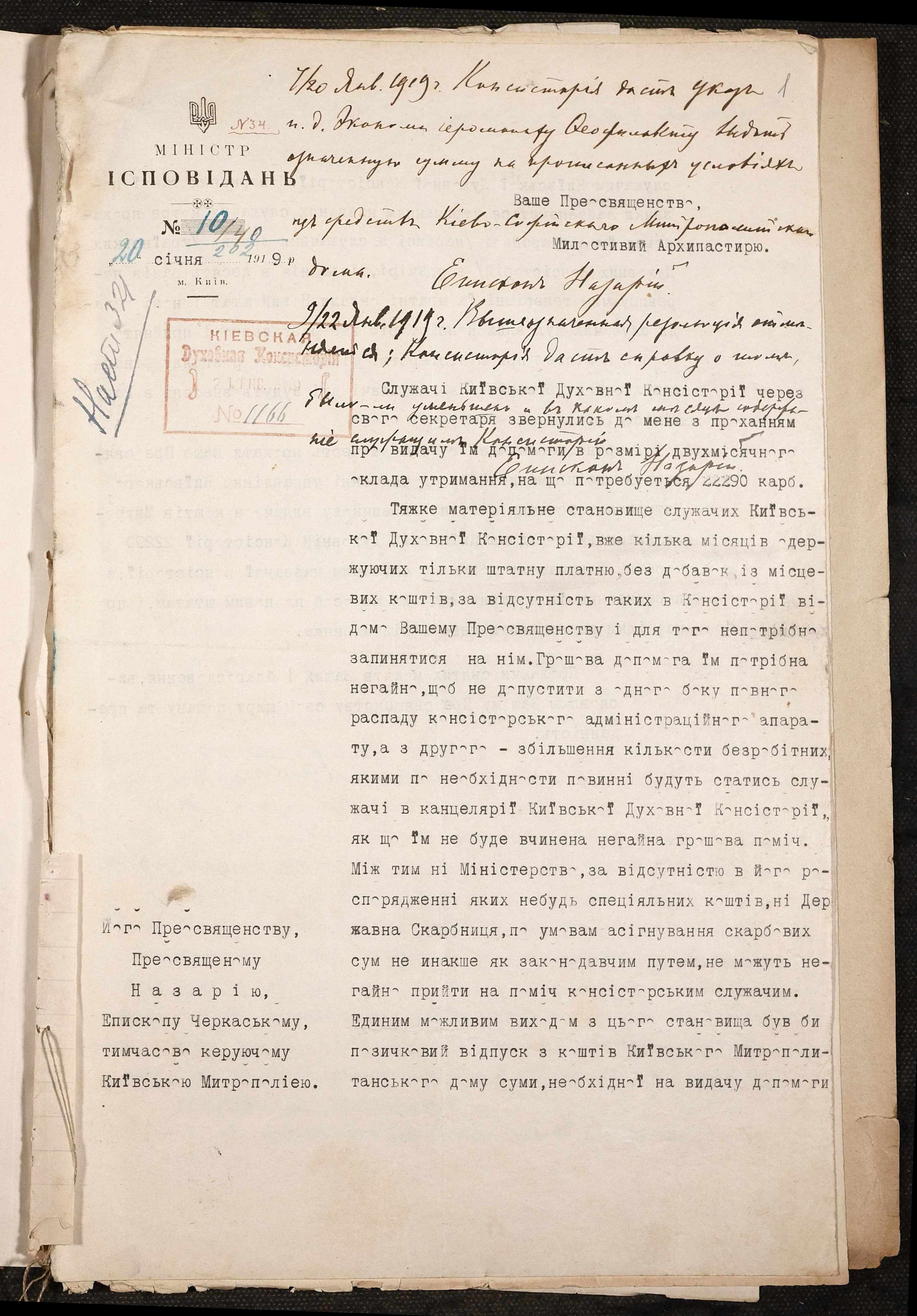 1919 р., січня 20. – Лист міністра віросповідань Івана Львовича Липи