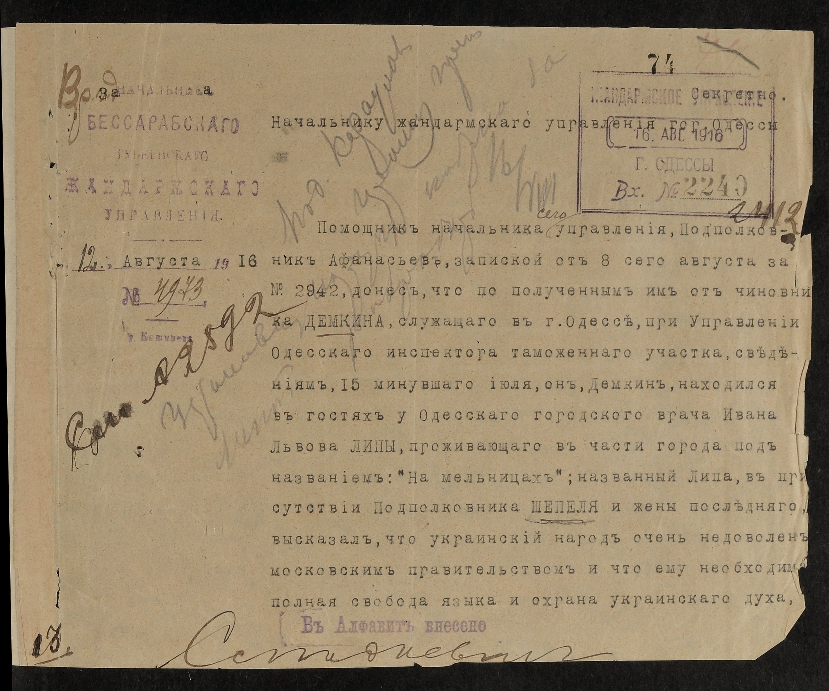 1916 р., серпня 12. – Повідомлення начальника Бессарабського губернського жандармського управління