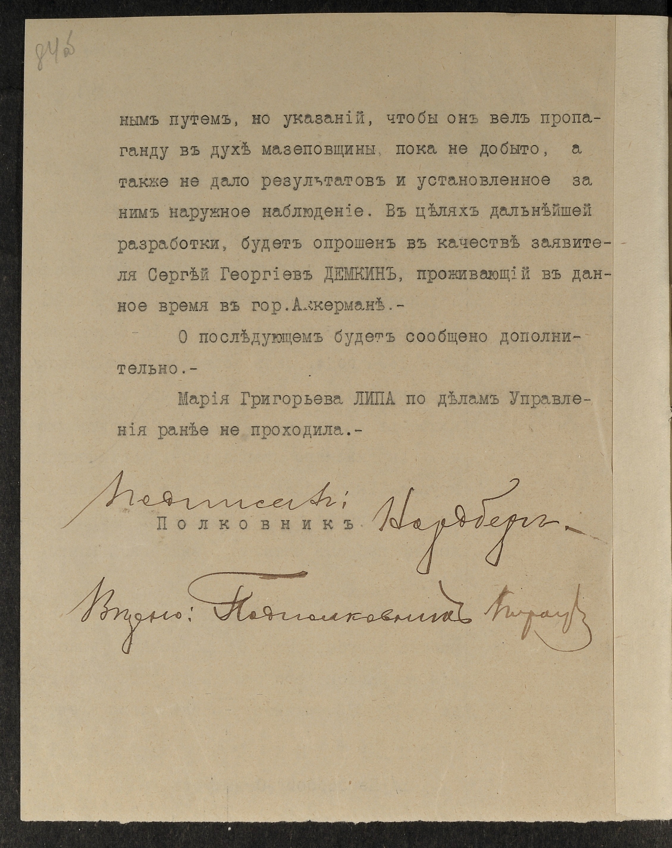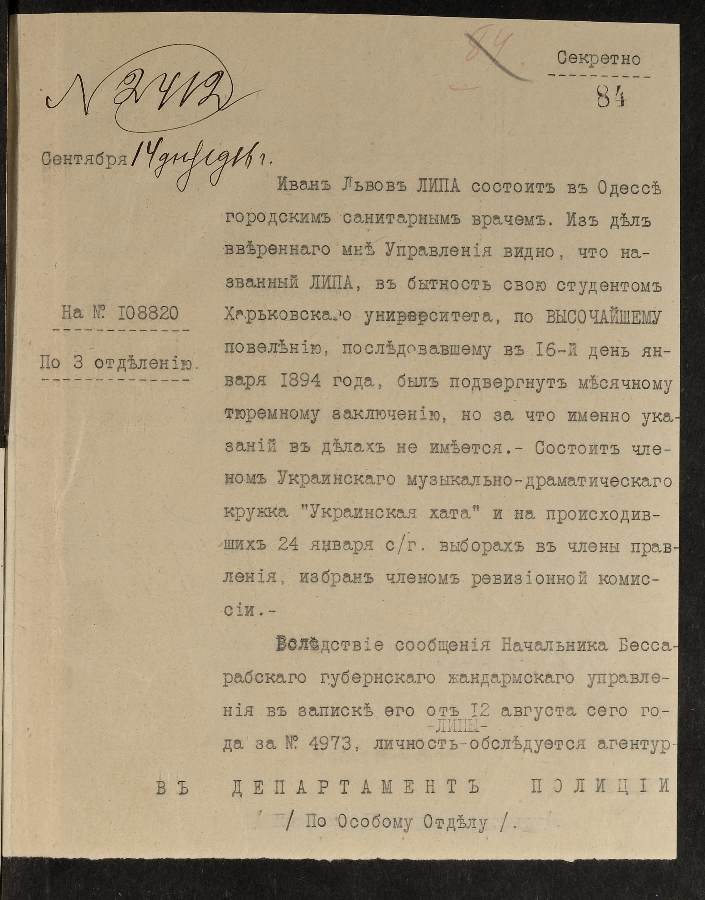 1916 р., вересня 14. – Записка начальника жандармського управління м. Одеси