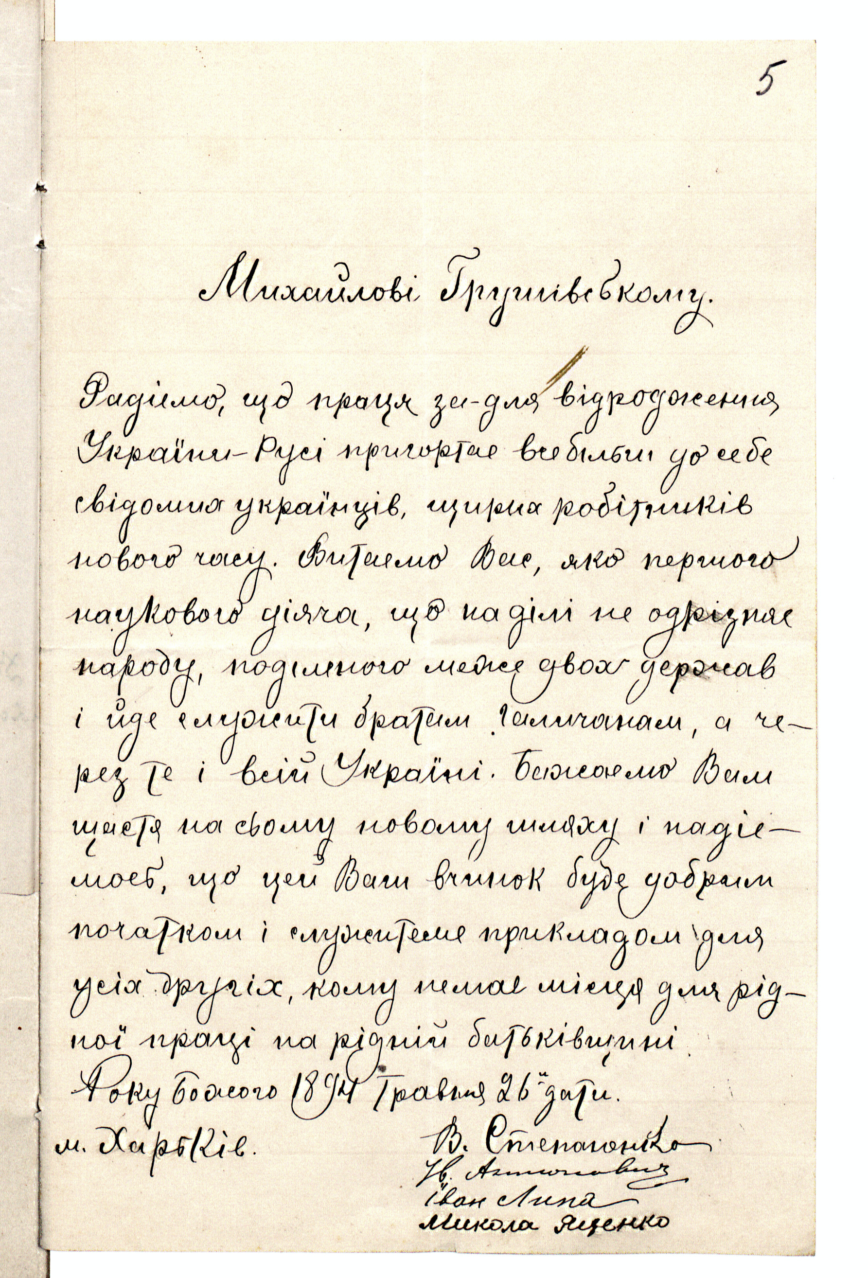 1894 р., травня 26. – Лист представників української інтелігенції м. Харкова,