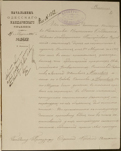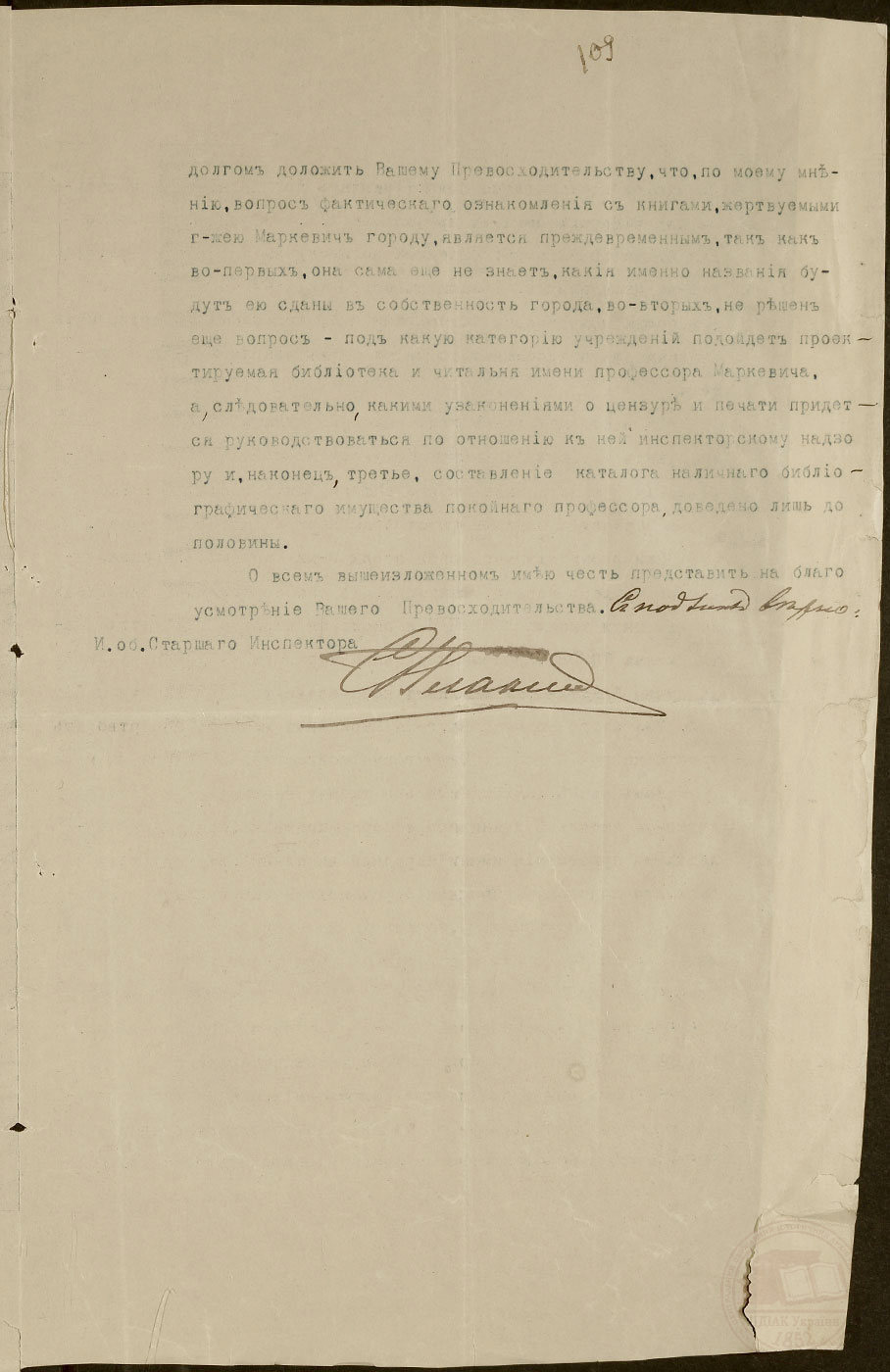 виконуючому обов’язки Одеського градоначальника Д. Б. Нейгардту про бажання вдови професора О. І. Маркевича пожертвувати в дар місту бібліотеку.