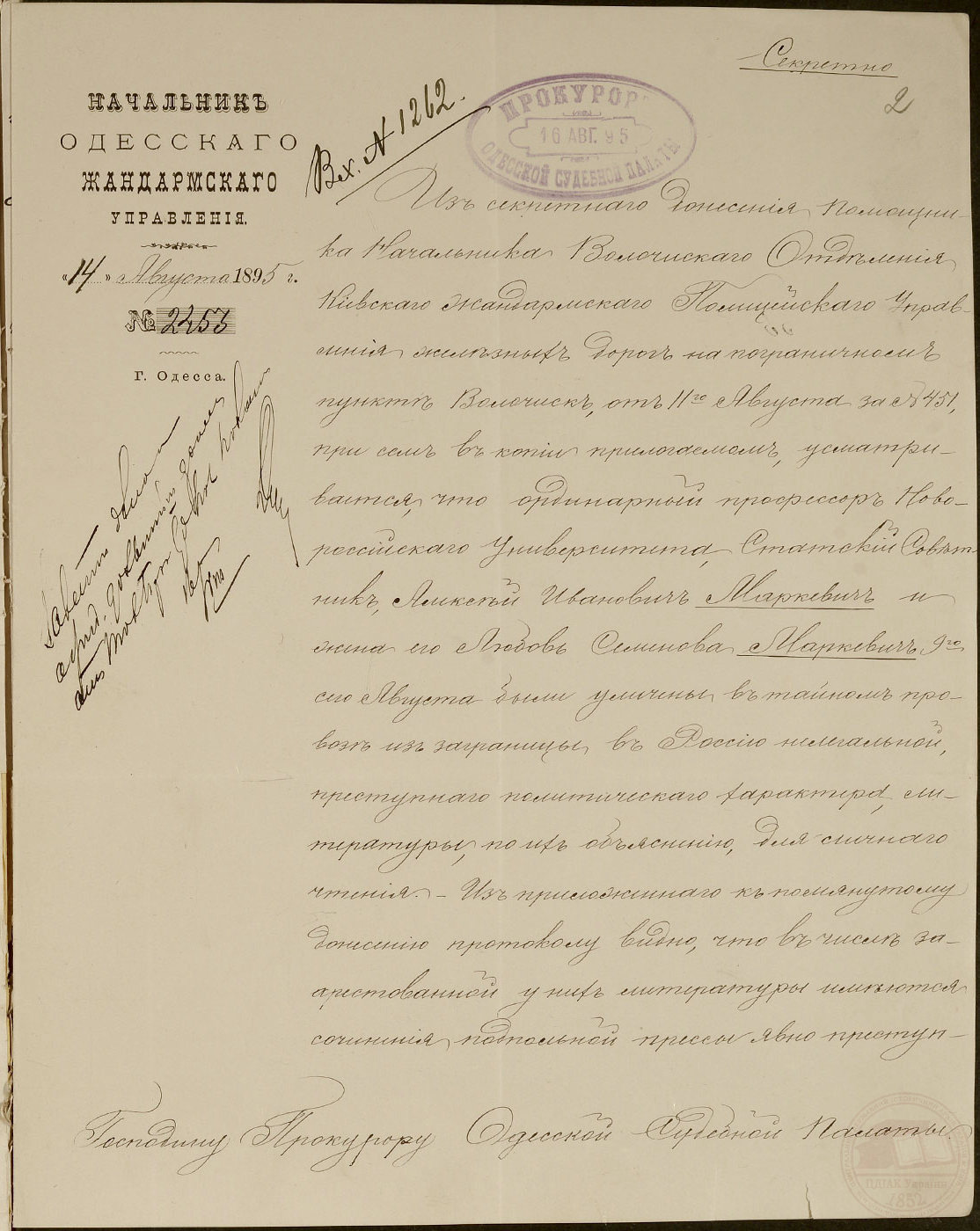 1895 р., серпня 14. – Повідомлення начальника Одеського жандармського управління полковника Пірамідова прокурору Одеської судової палати