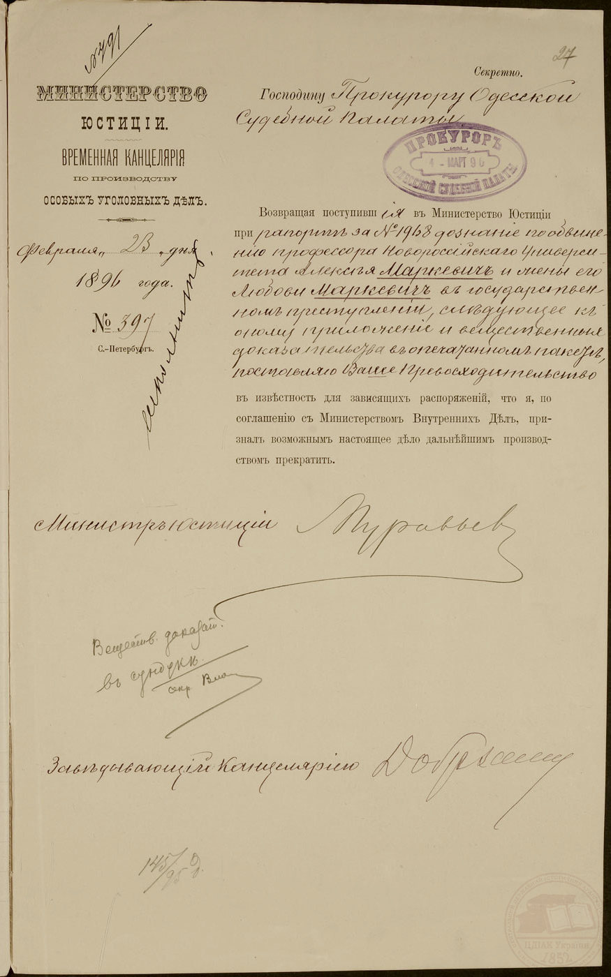 1896 р., лютого 23. – Повідомлення міністра юстиції М. В. Муравйова прокурору Одеської судової палати Кукуранову