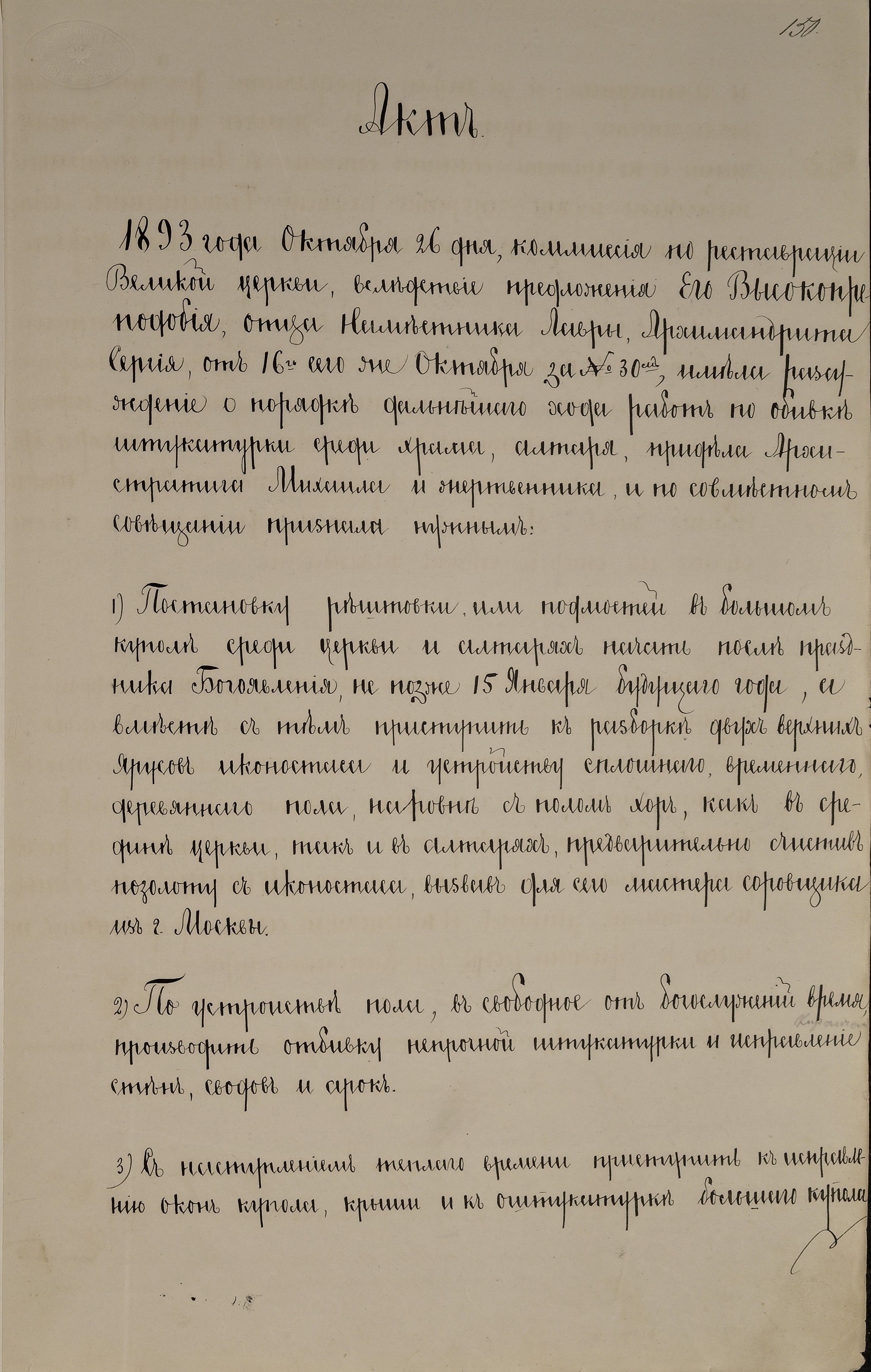 1893 р., жовтня 26. – Акт комісії з реставрації Великої церкви з рішенням про