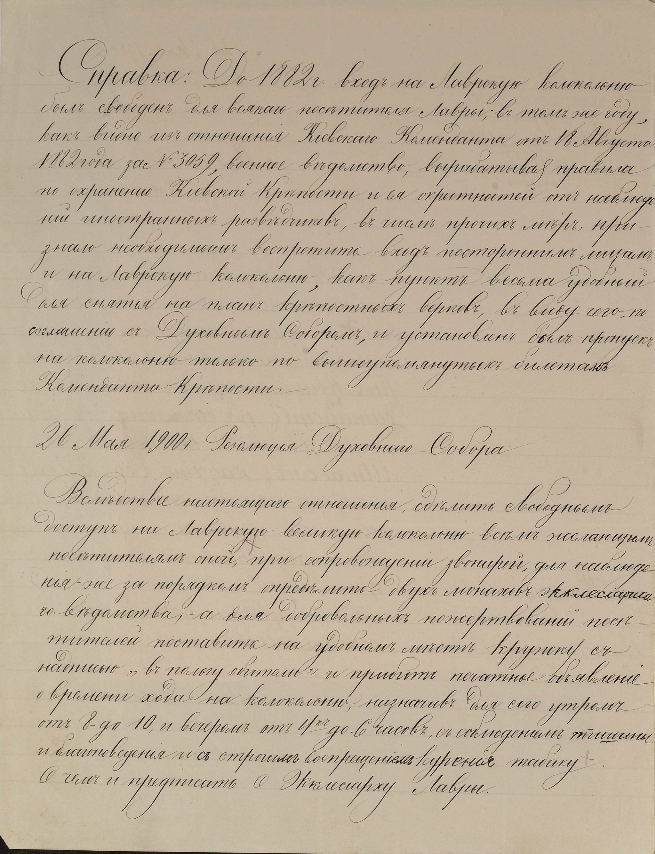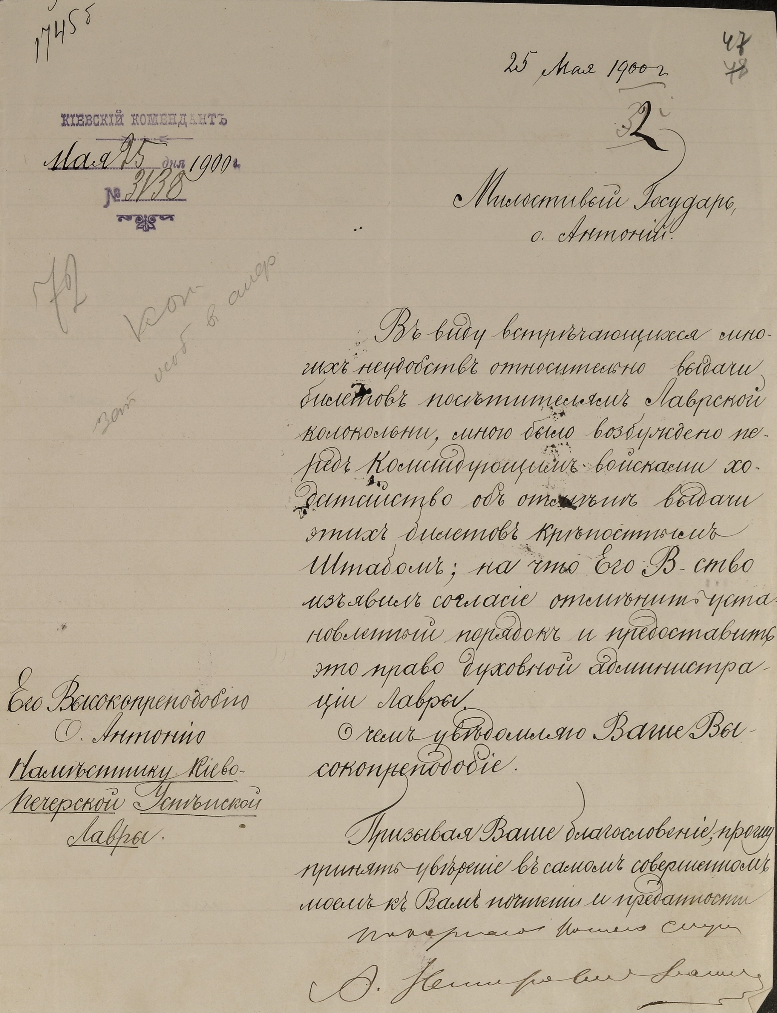 1900 р., травня 25. – Дозвіл київського військового коменданта керівництву Києво-Печерського