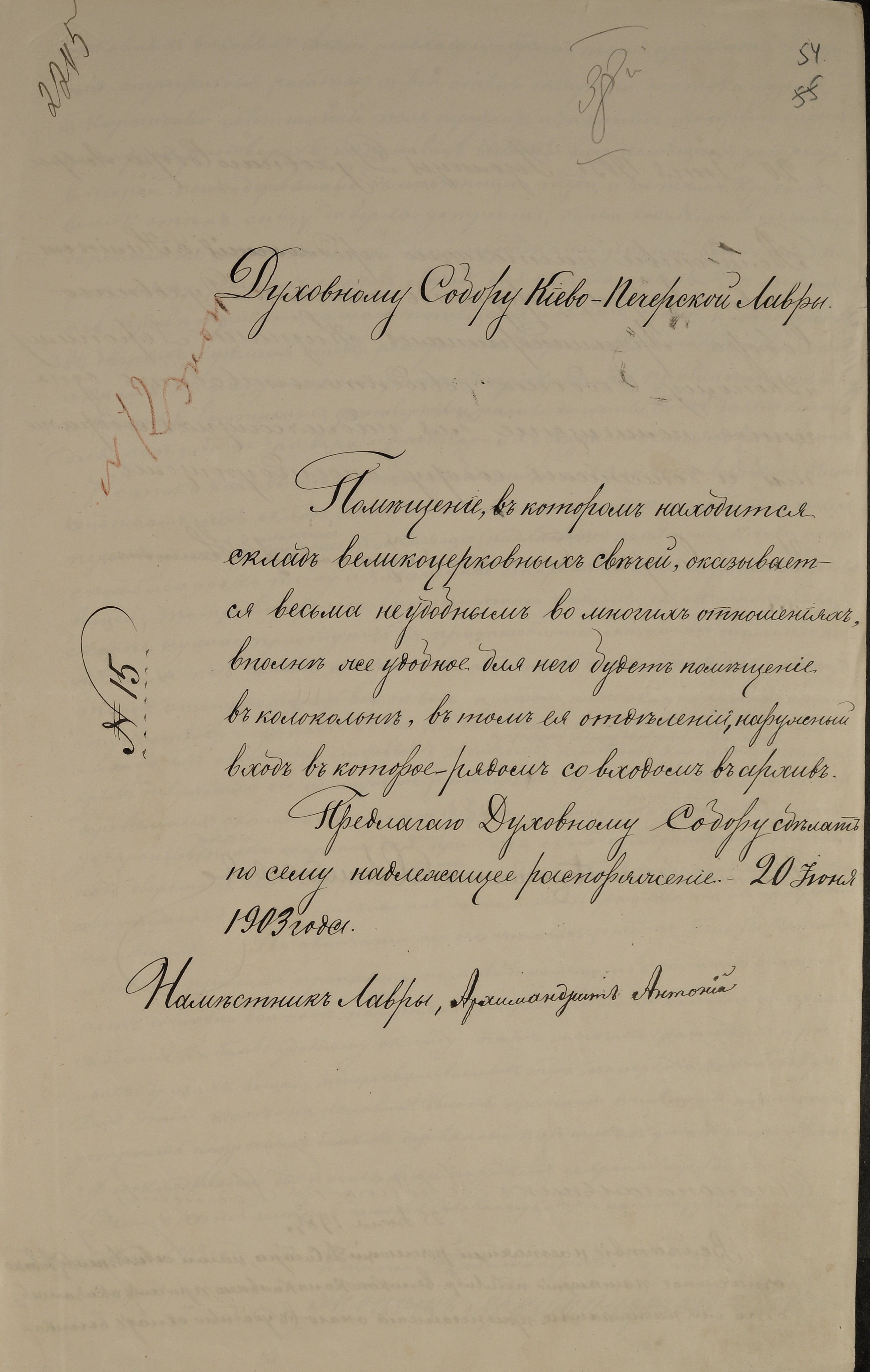 1903 р., червня 20. – Пропозиція намісника архімандрита Антонія щодо перенесення складу свічок