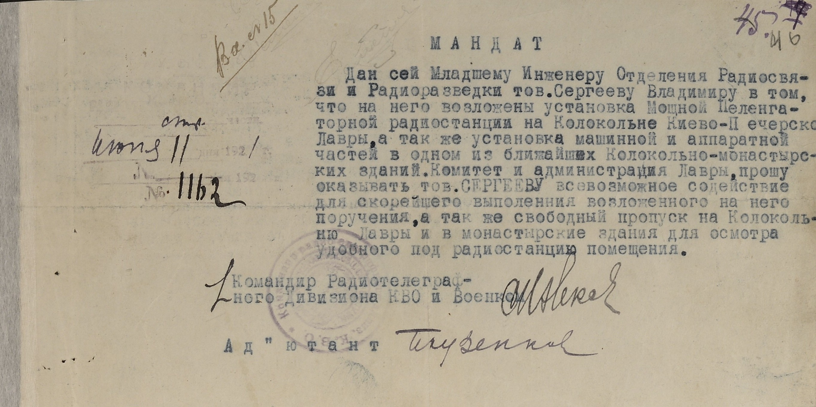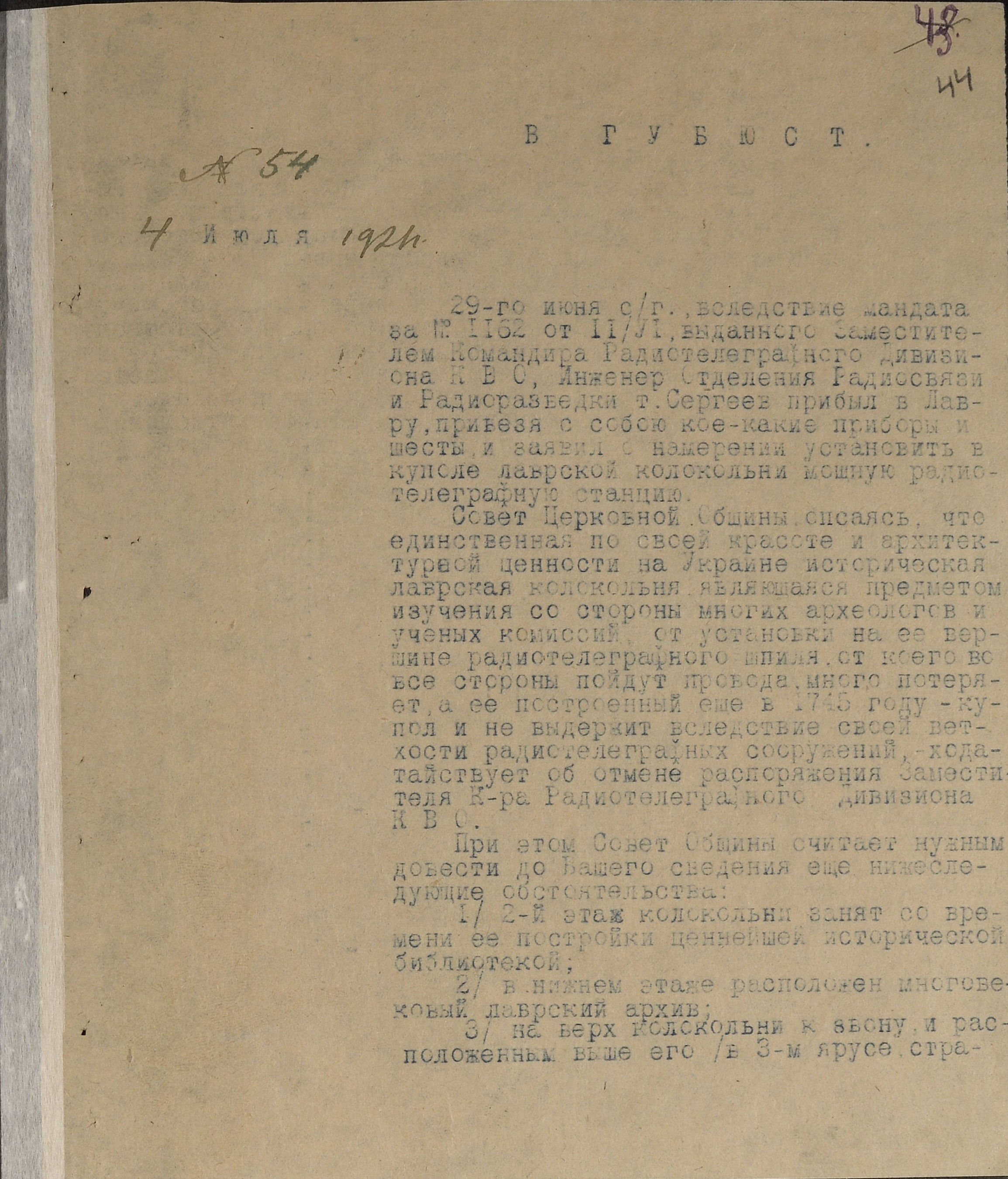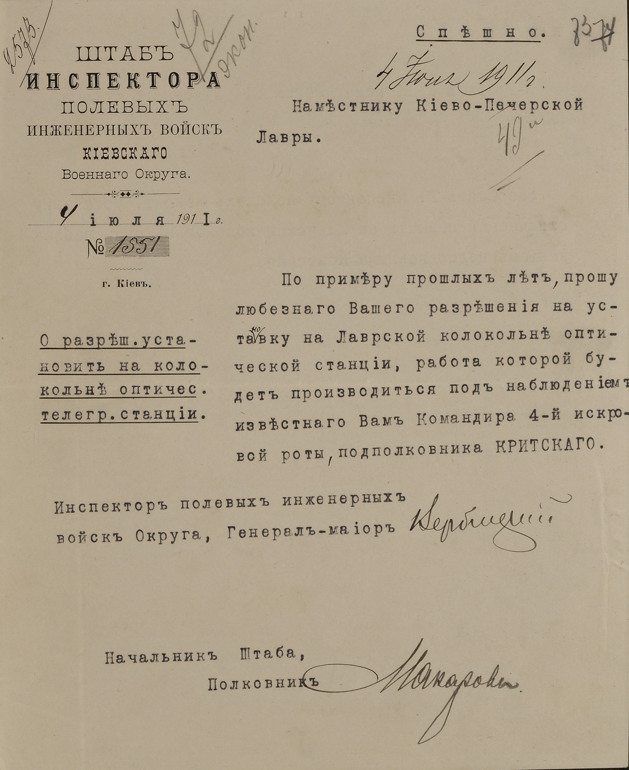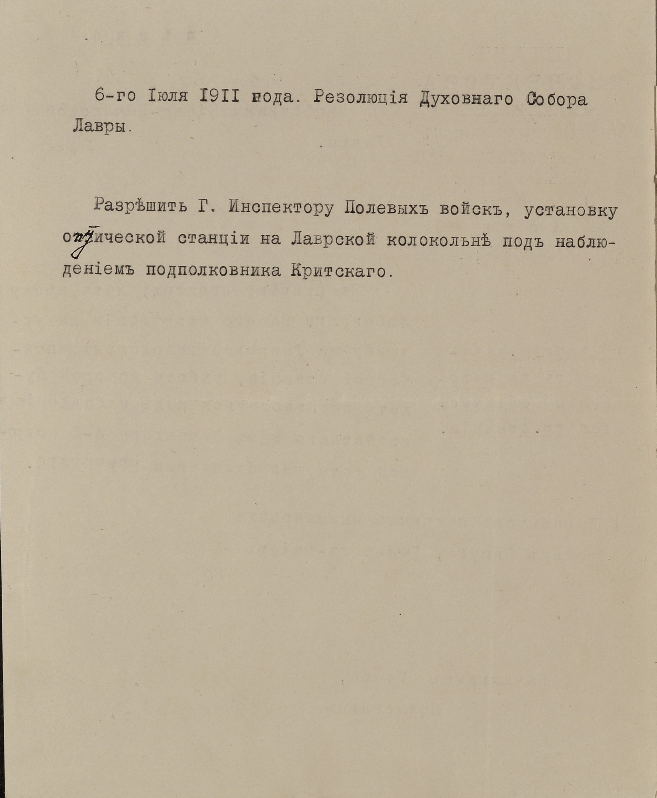 з лаврським намісником питання встановлення на дзвіниці в 1911 р. оптично-телеграфної станції.