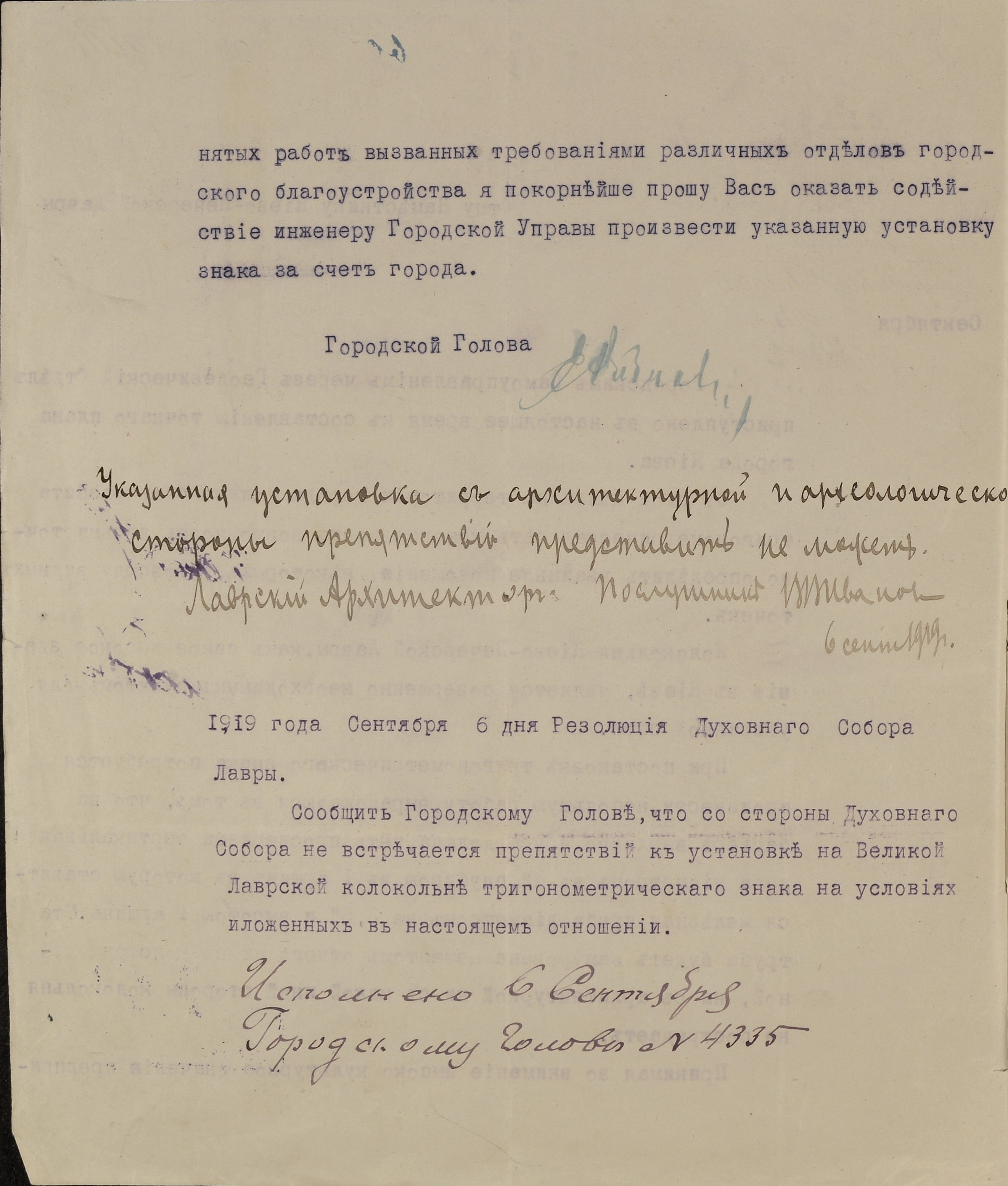 1919 р., вересня 5–6. – Узгодження питання встановлення на дзвіниці геодезичного