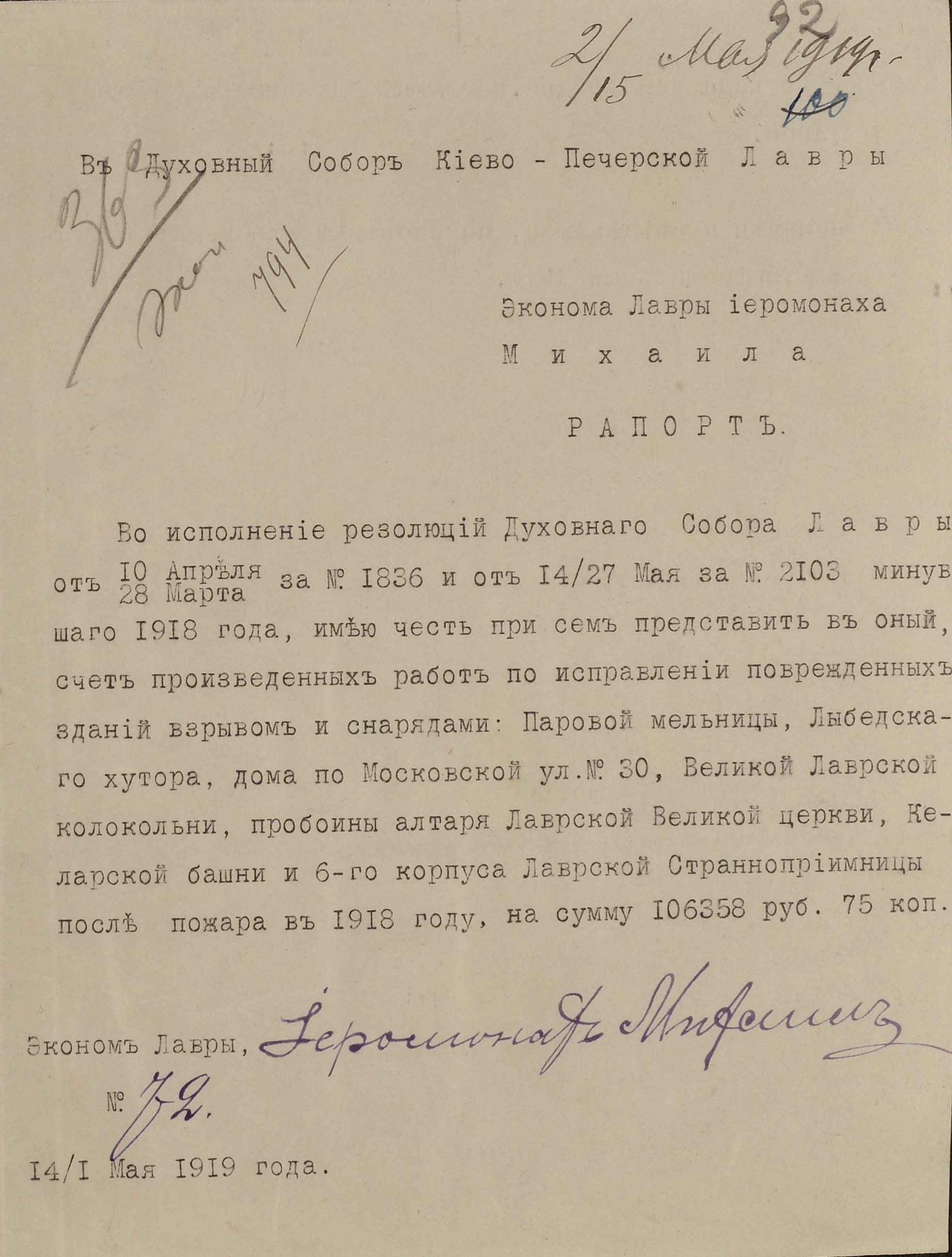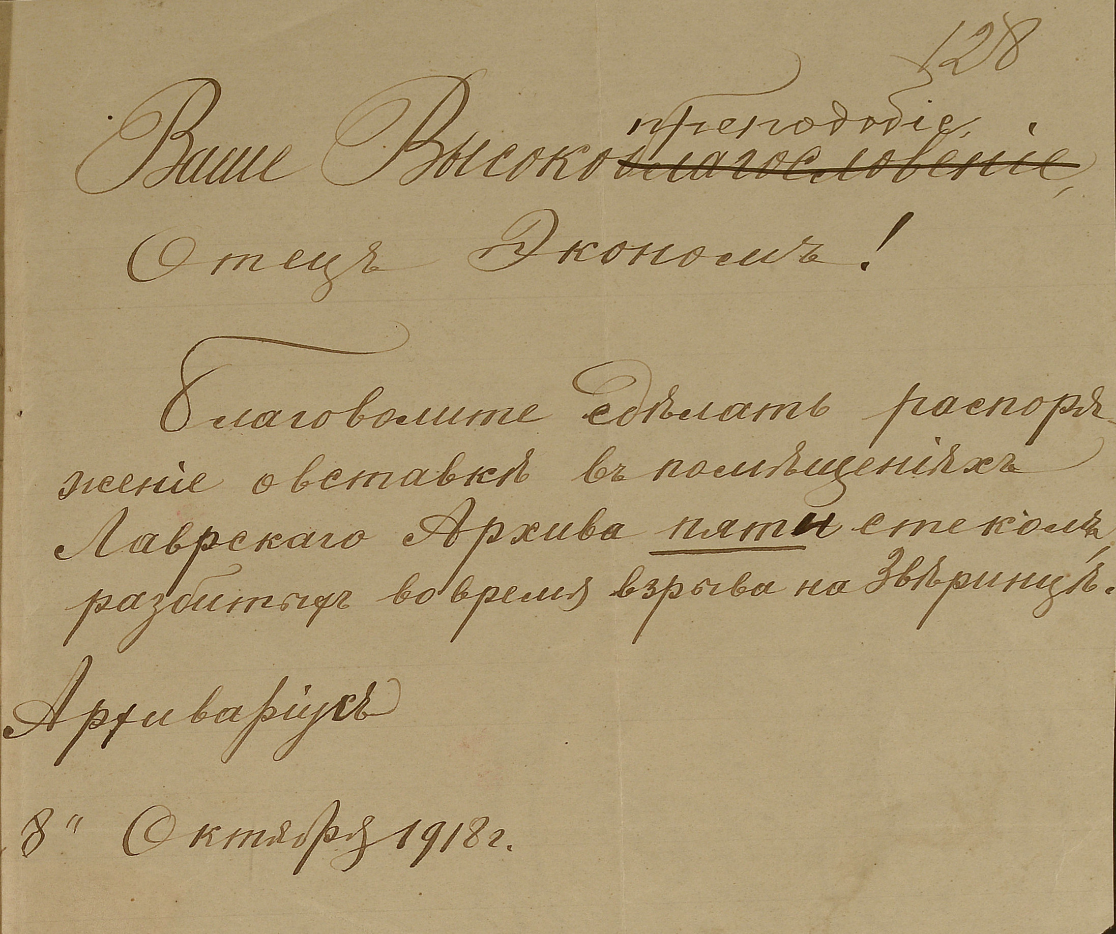 1918 р., жовтня 8. – Рапорт архіваріуса Києво-Печерської лаври щодо необхідності ремонту п’яти
