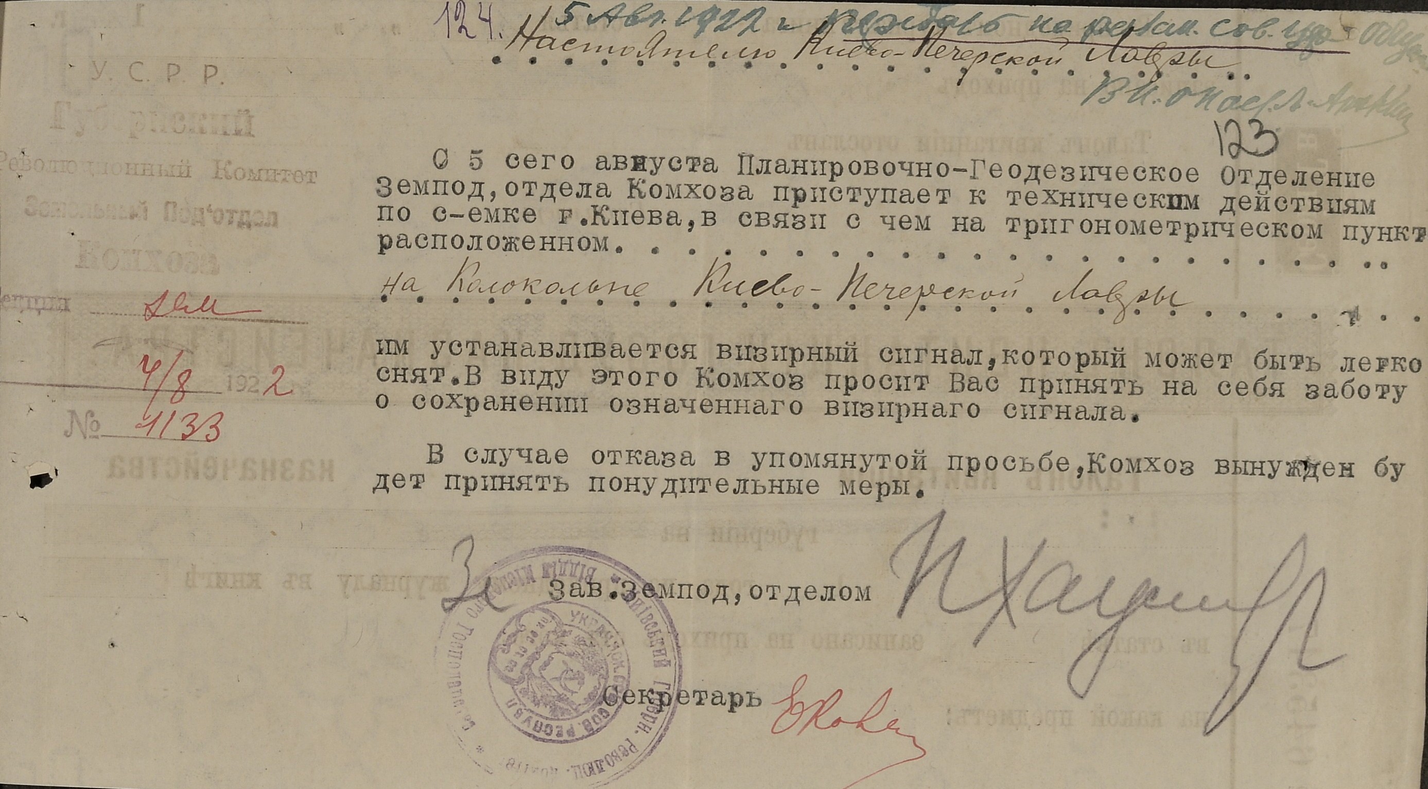1921 р., липня 4., 1922 р., серпня 4. – Документи щодо розташування геодезичного обладнання
