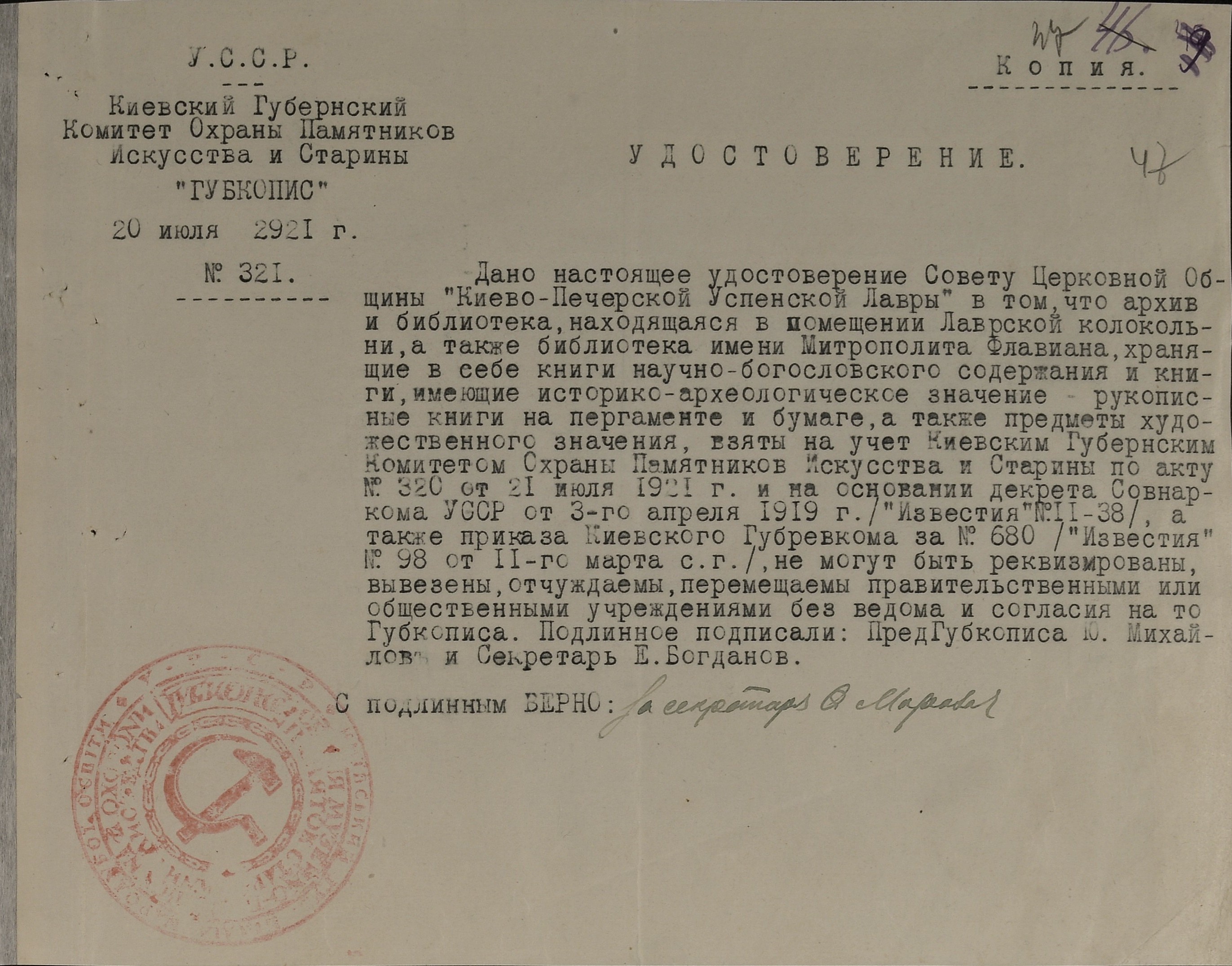1921 р., липня 20 – вересня 21. – Копія посвідчення Київського губернського комітету охорони