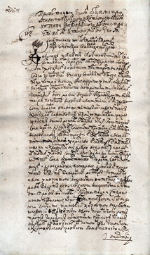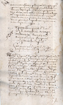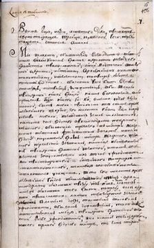 1638 р., жовтня 16. ̶ Скарга київського митрополита Петра Могили на луцького єпископа Афанасія Пузину, який, не маючи привілею на єпископство, віддав в оренду за малу плату деякі належні Луцькій єпархії маєтки, чим заподіяв збитки православній церкві. Перший аркуш.