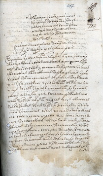 1633 р., вересня 17. ̶ Скарга київського митрополита Петра Могили на королівського ротмістра Баворовського за незаконні побори з належного Києво-Печерського монастирю с. Городок. Перший аркуш.