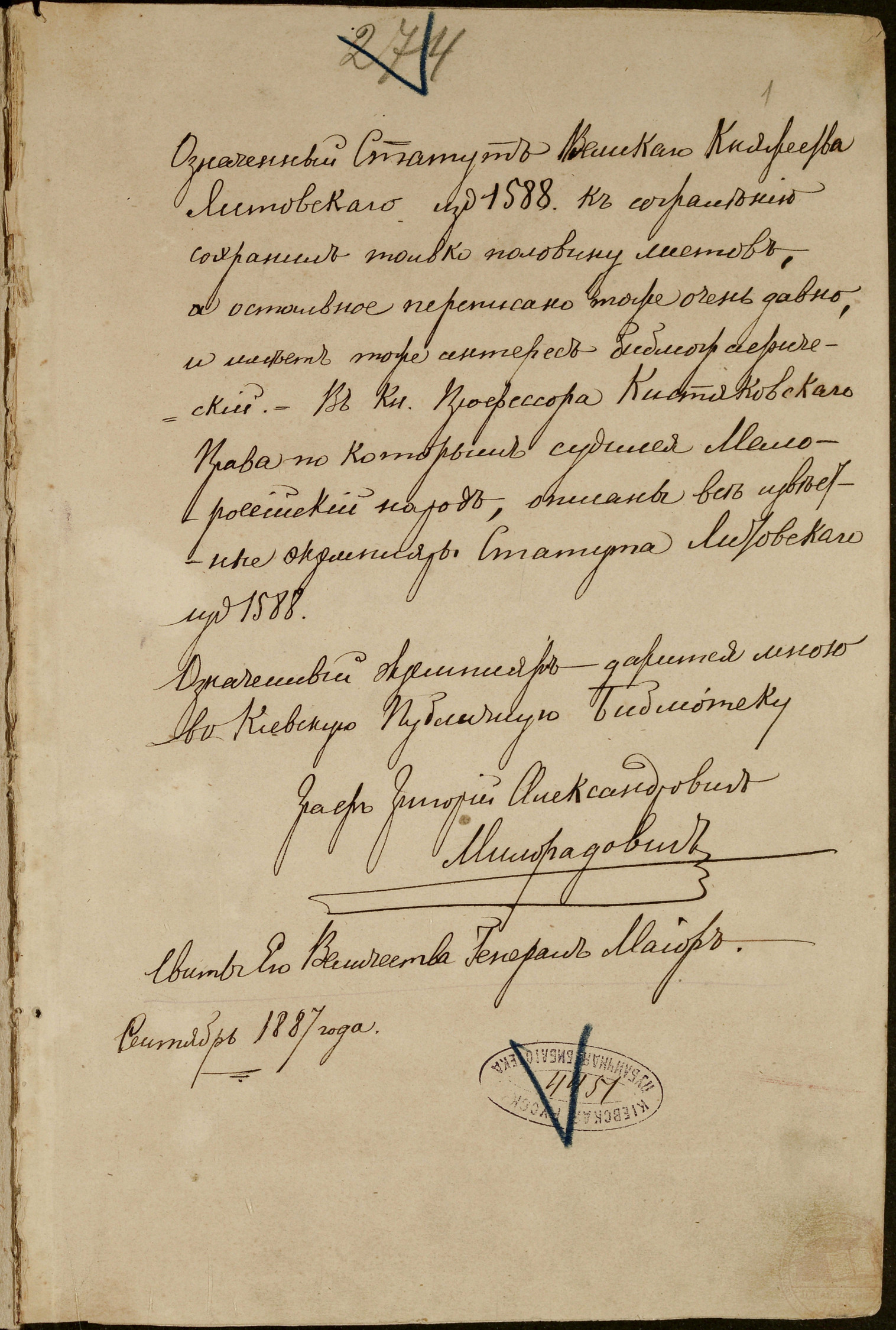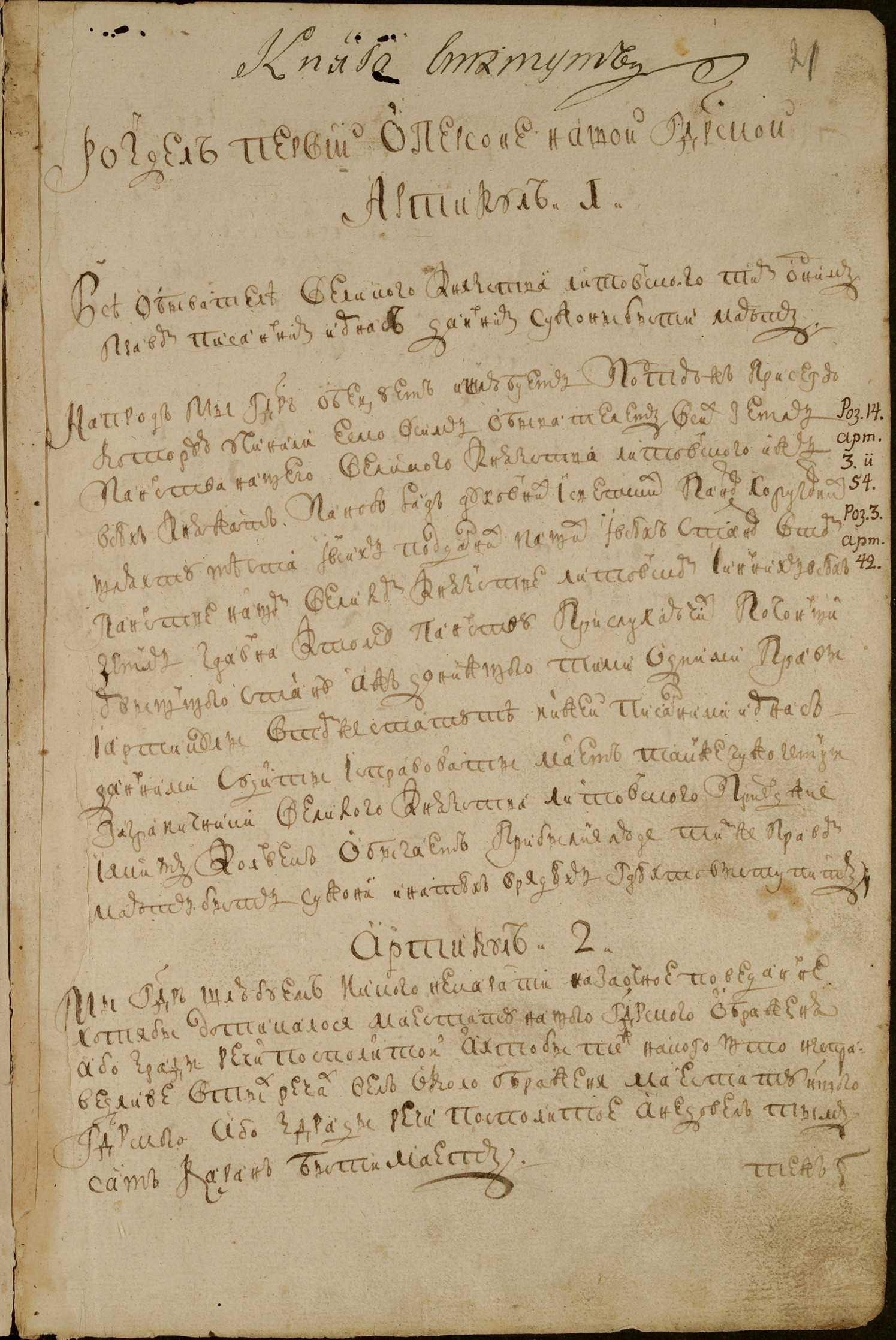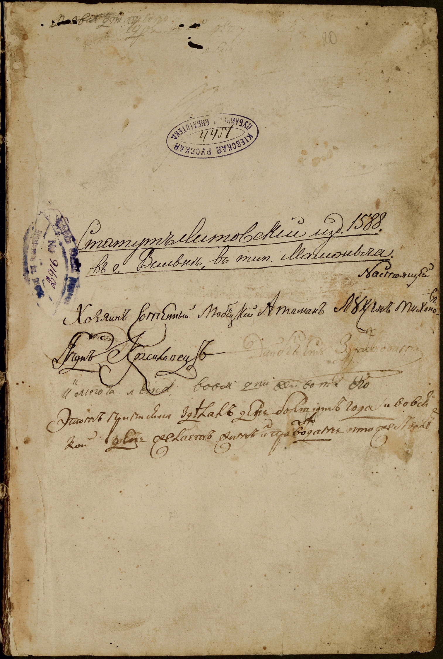 ЦДІАК України, ф. 220, оп. 1, спр. 210, арк. 1 і 9 зв. Копія XVIII ст. Мова староукраїнська.