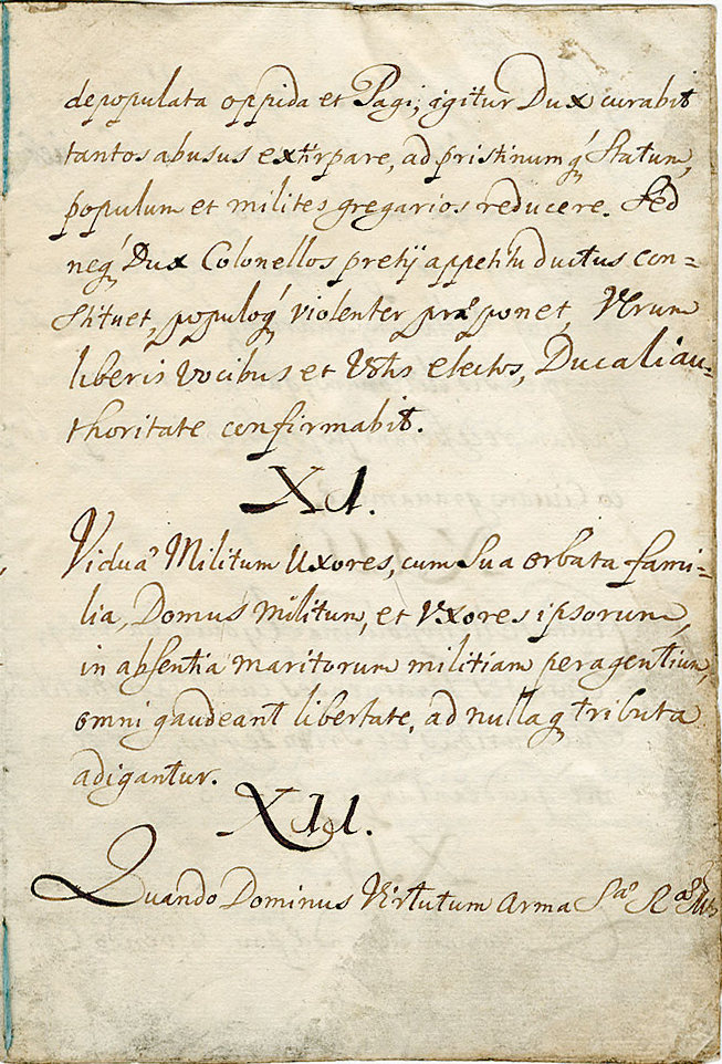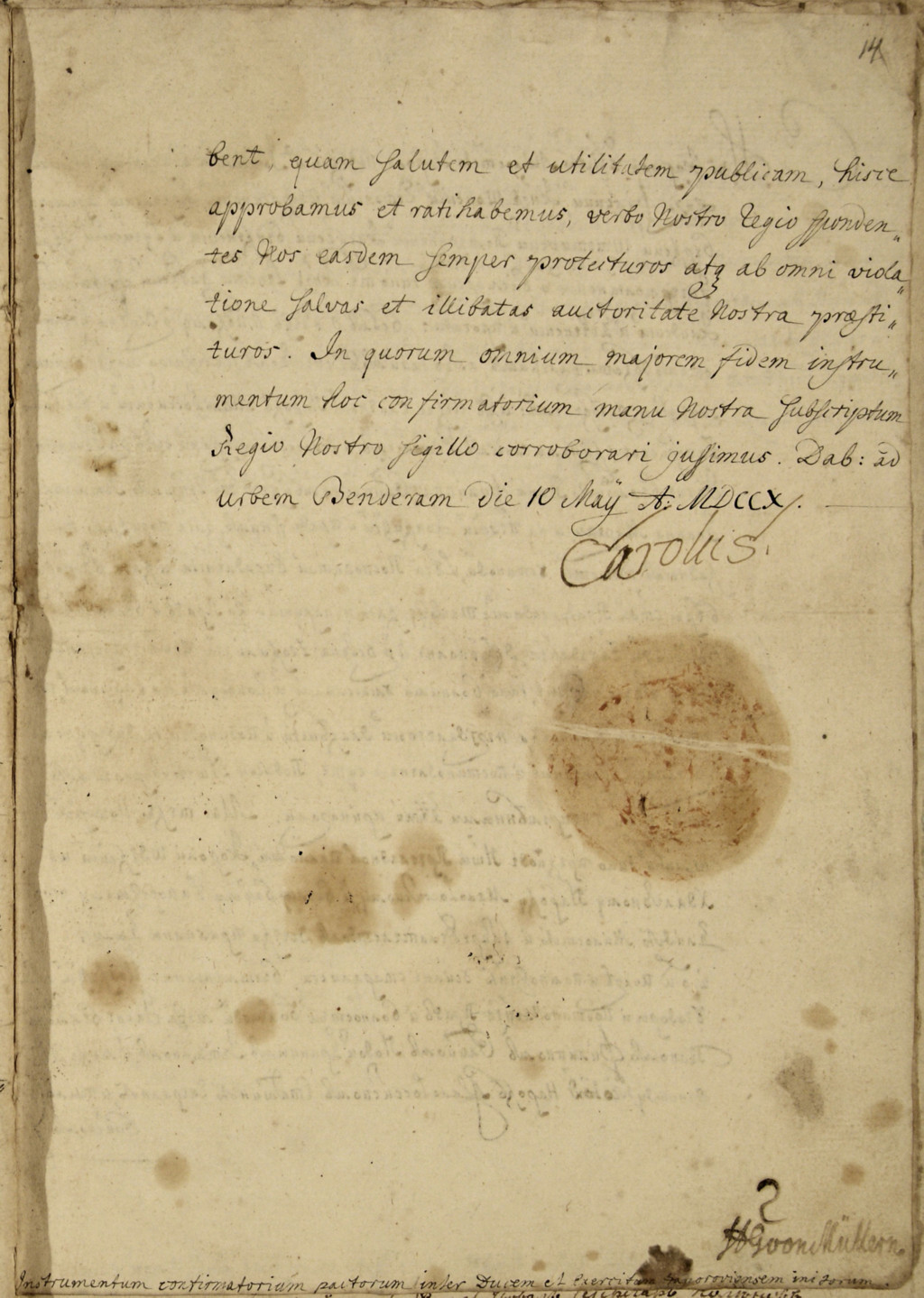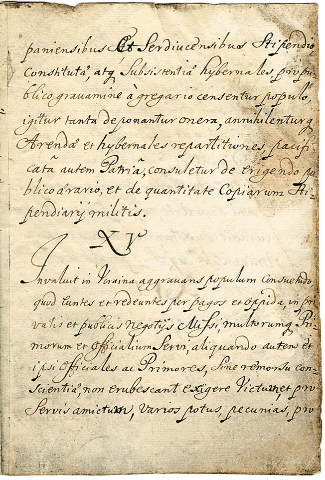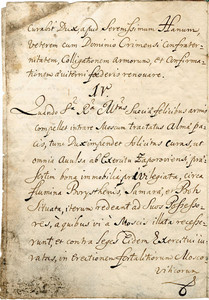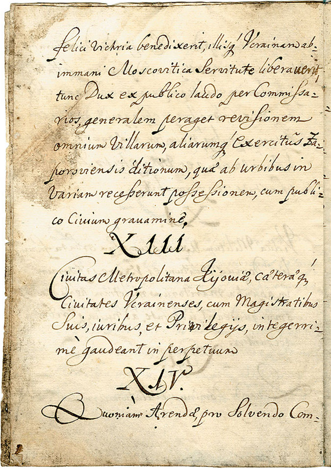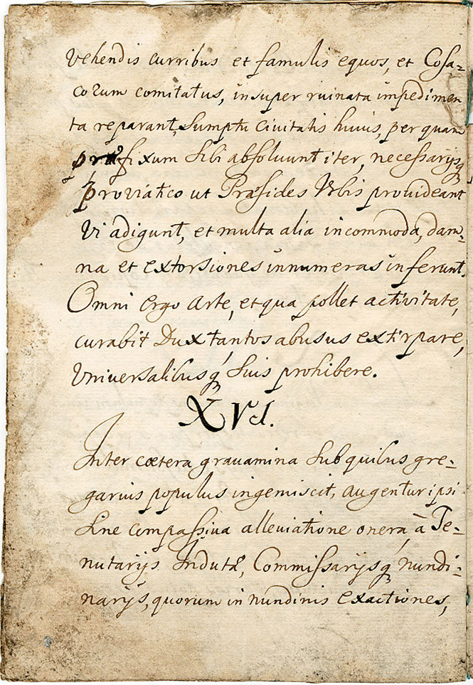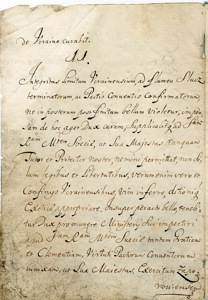 Копія з оригіналу, що зберігається в Національному архіві Швеції, м. Стокгольм, колекція «Cosacica». Складається з 16 пунктів. Мова латинська.