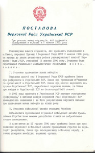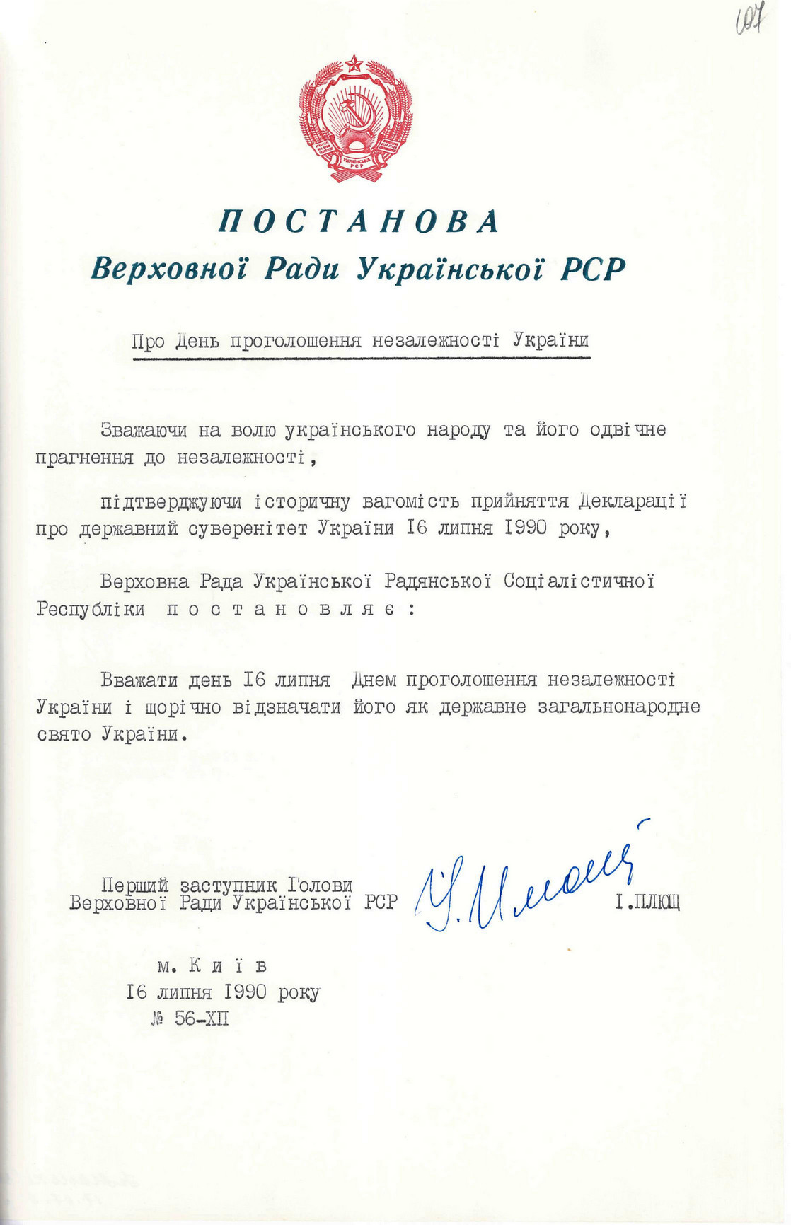 Постанова Верховної Ради Української РСР про День проголошення незалежності України. Київ, 16 липня 1990 р.