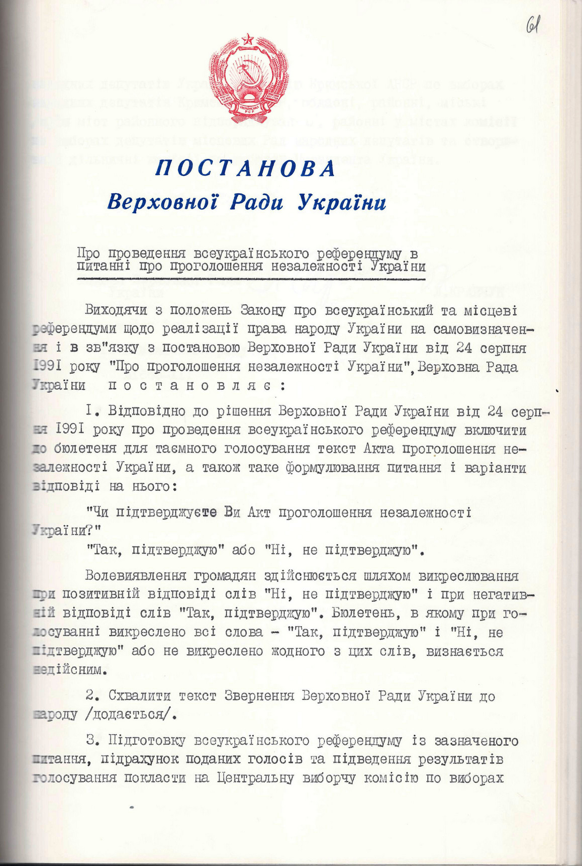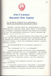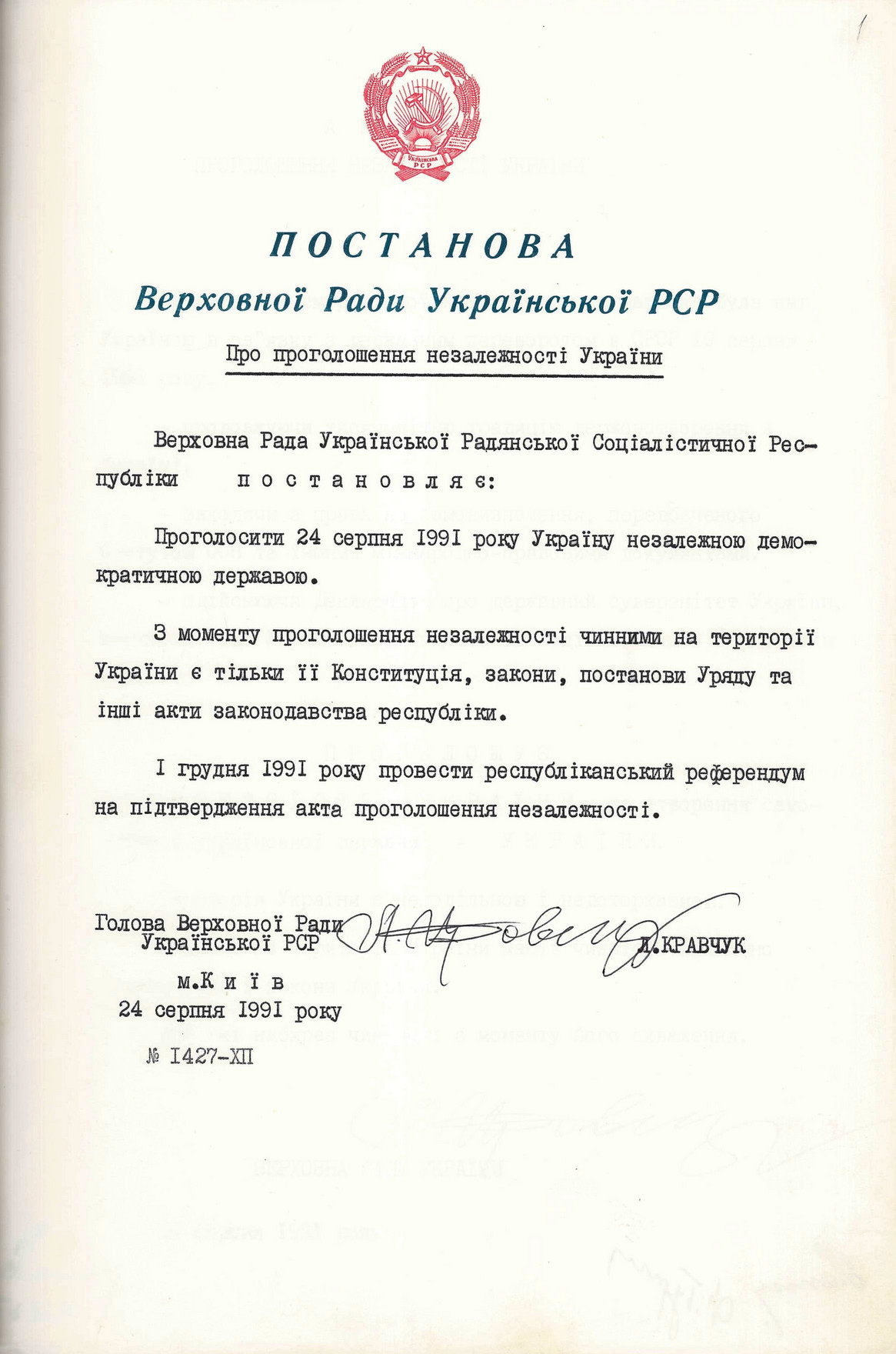 Постанова Верховної Ради Української РСР “Про проголошення незалежності України”. Київ, 24 серпня 1991 р.