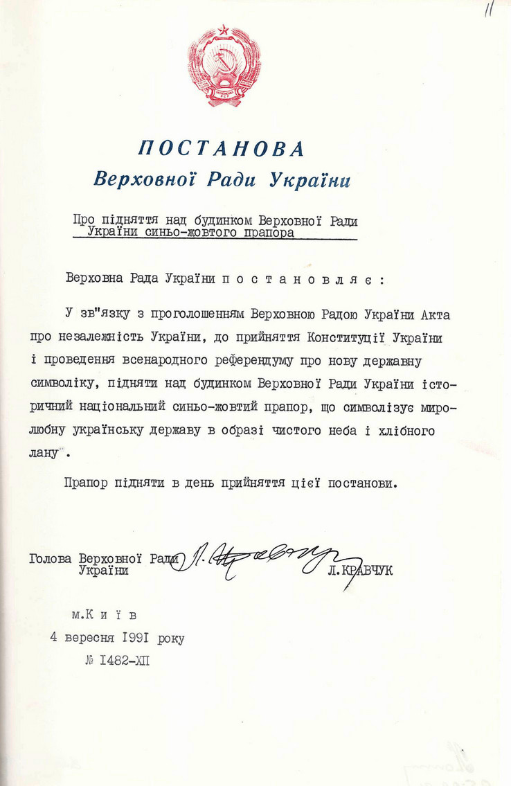 Постанова Верховної Ради України про підняття над будинком Верховної Ради України синьо-жовтого прапора. Київ, 4 вересня 1991 р.