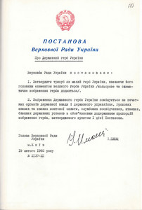 Постанова Верховної Ради України “Про Державний герб України”. Київ, 19 лютого 1992 р.