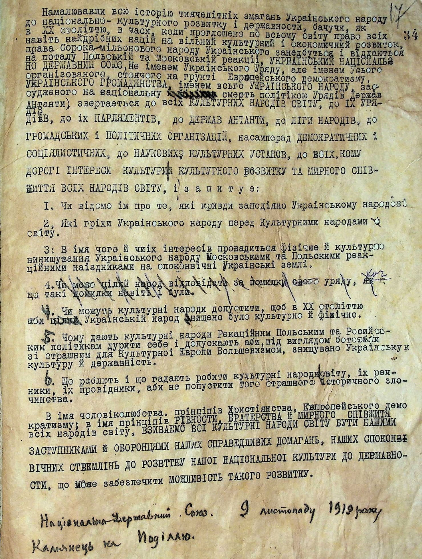 Протест Українського національно-державного союзу до культурних народів світу. Кам’янець-Подільський, 9 листопада 1919 р.