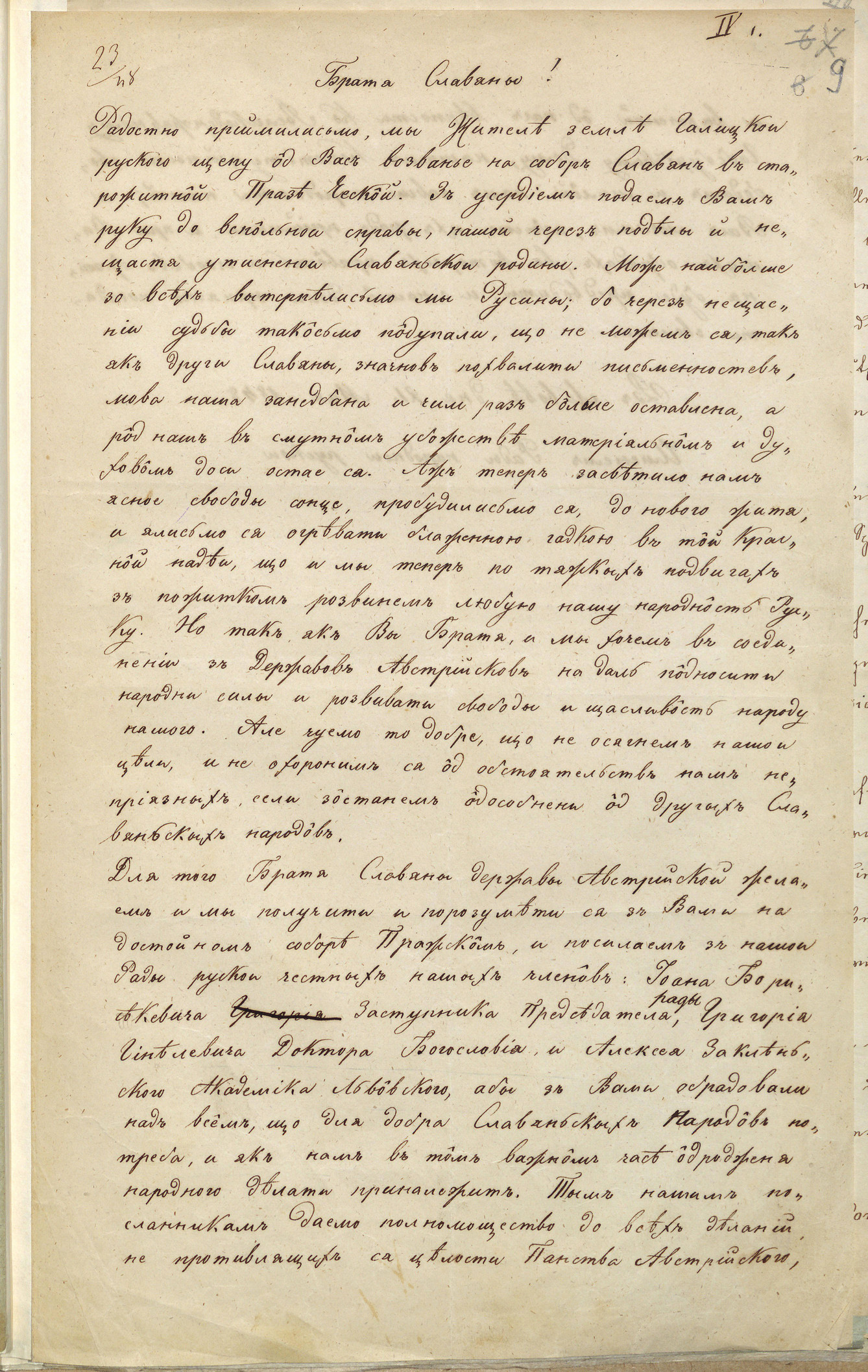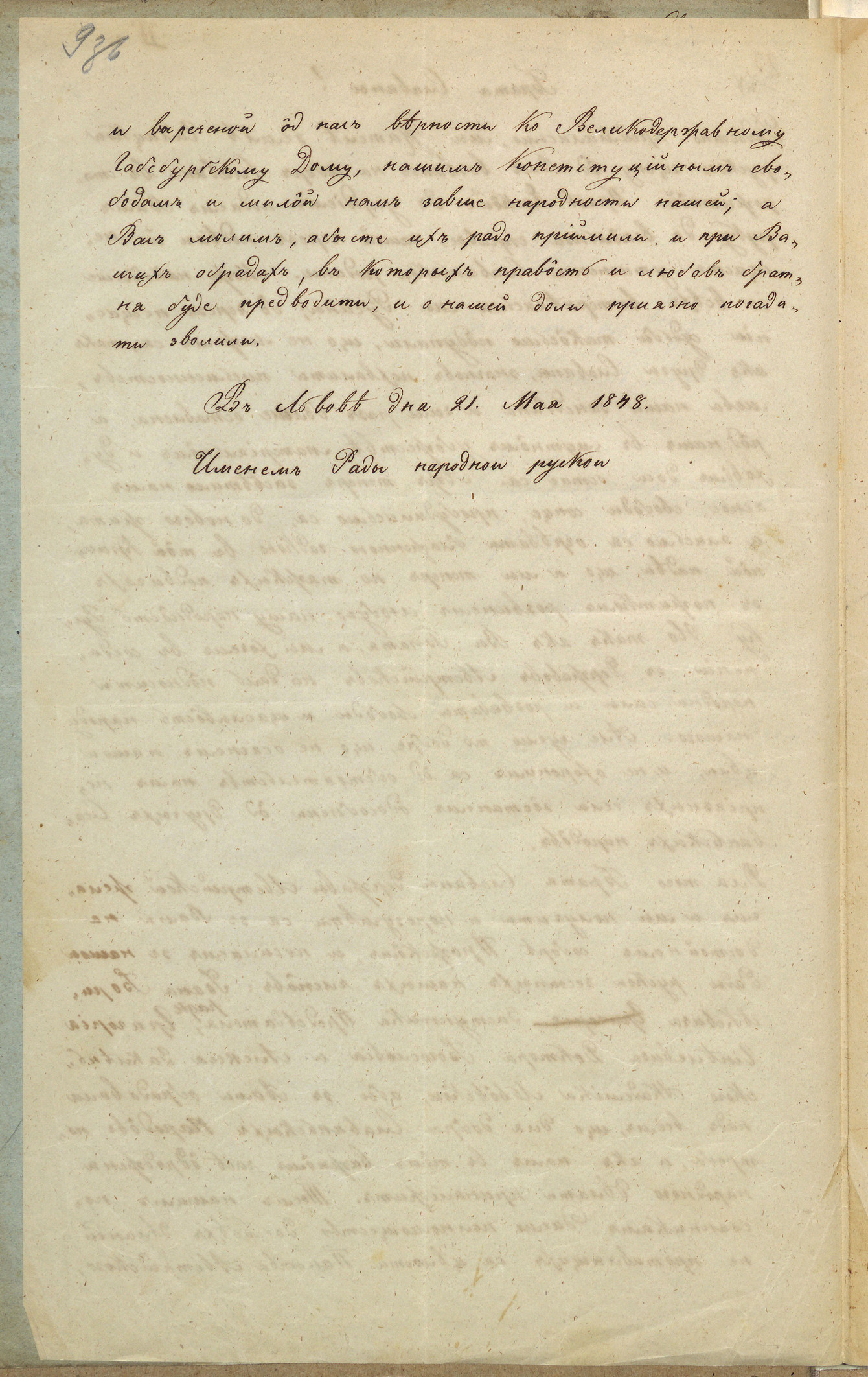 з підтримкою організації слов’янського з’їзду у Празі та закликом до об’єднання всіх слов’янських народів. Львів, 21 травня 1848 р.